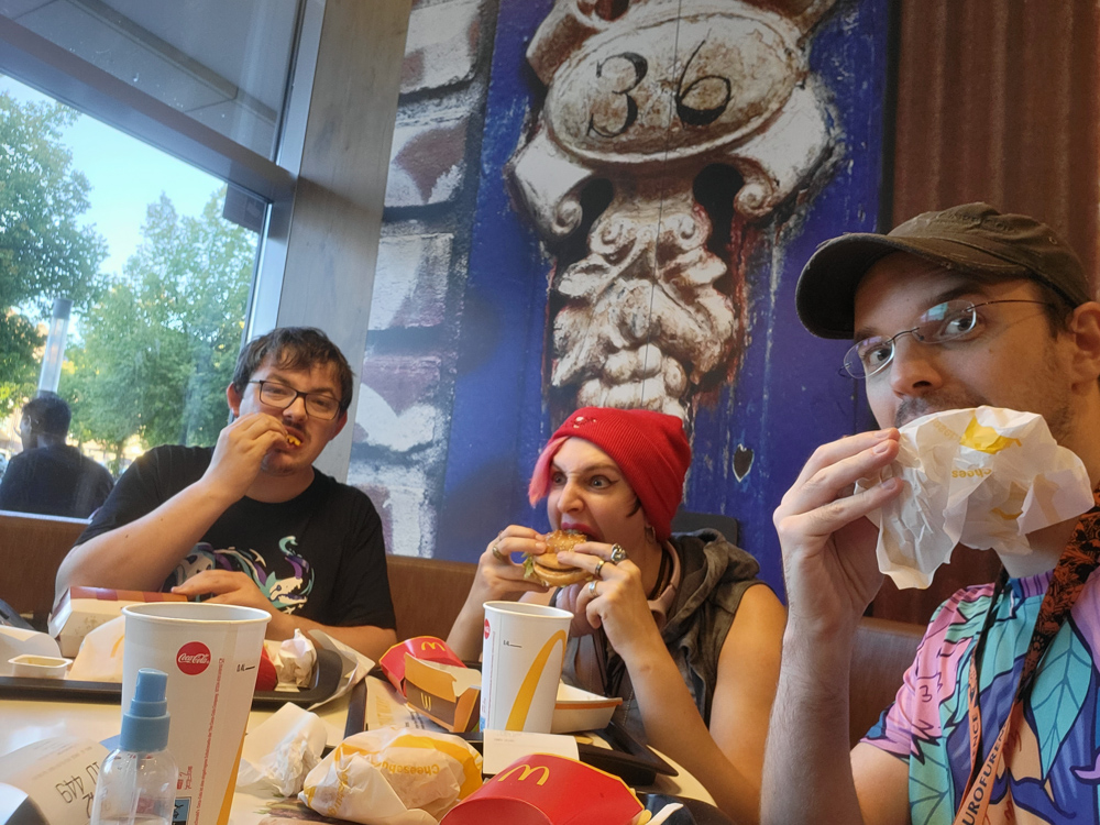 We met a fellow furry on the train, Eva Keniva, who was taking the same route. She spent a while chatting with Chiros about DnD, something I know nothing about. In Osnabück, we went to McDonald's since we had 1.5 hours to kill.