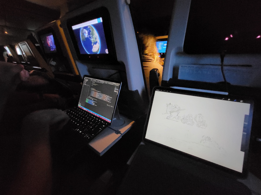 Since I still had some work to finish, I pre-paid for "high-speed" in-flight internet. The actual downstream bandwidth was around 6 MBit, with 600ms ping, on the Inmarsat network. SSH was a bit tedious, but it worked surprisingly well. I finished up work, and later we watched Knives Out, which we've been meaning to watch for a long time! Great movie!