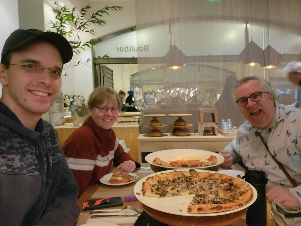 Kilmo and Maple went to get some Tiki cocktails at Trader Vic's, we got some smashburgers, then we joined them. After a short flight, we took an Uber to their place and flopped onto our inflatable bed.