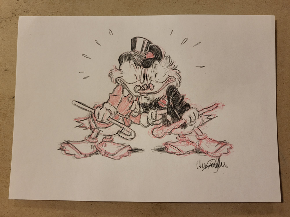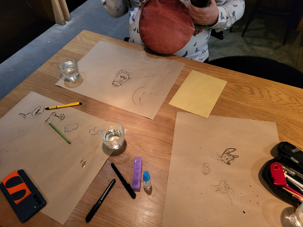 Henrieke, Jeff and I wandered around, looking for a place to sit down and eat. The only real option was a pizza place, where we ended up getting a table after some waiting. We chatted about all kinds of comic-related things and sketched on our placemats while having tasty cheese and mushroom pizza. Eventually we felt like we should get out of the restaurant, but since Jeff still felt like hanging out, we sat down for a coffee. Henrieke and Jeff still chatted about Carl Barks for a while, and Henrieke made a duck drawing for Jeff.