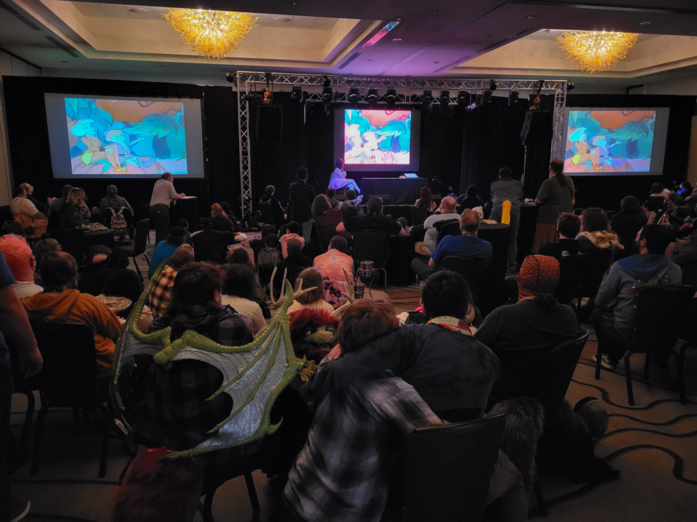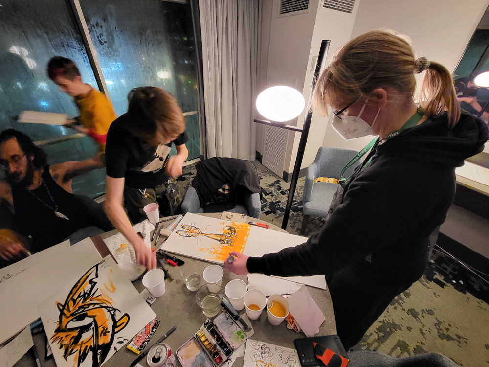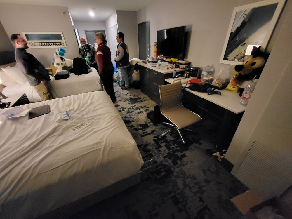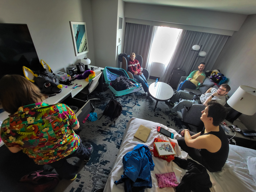 I spent some time chatting with Selwyn and Foxo about Australia, and I gave Foxo a card to deliver to FlameDrake. When it was time to go to bed we said a sad good-bye to Kipper, Drex, Paco, Koidel and all the others and went to the Hilton with Zahzu and Muse. We ran into Zarafa and Eden nerded out with him on the way to the elevator. We went to Zahzu's room to properly say good-bye there and then dropped by at Keovi's party again. Keovi and Kenket were creating some drunk art, and Henrieke joined for a bit, making a beautiful collab with Kenket. Maple was there as well.