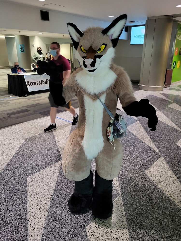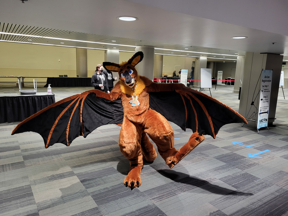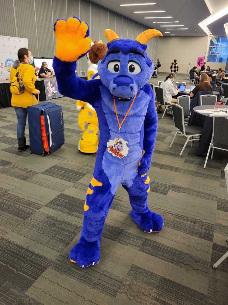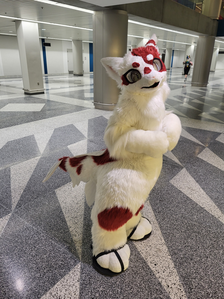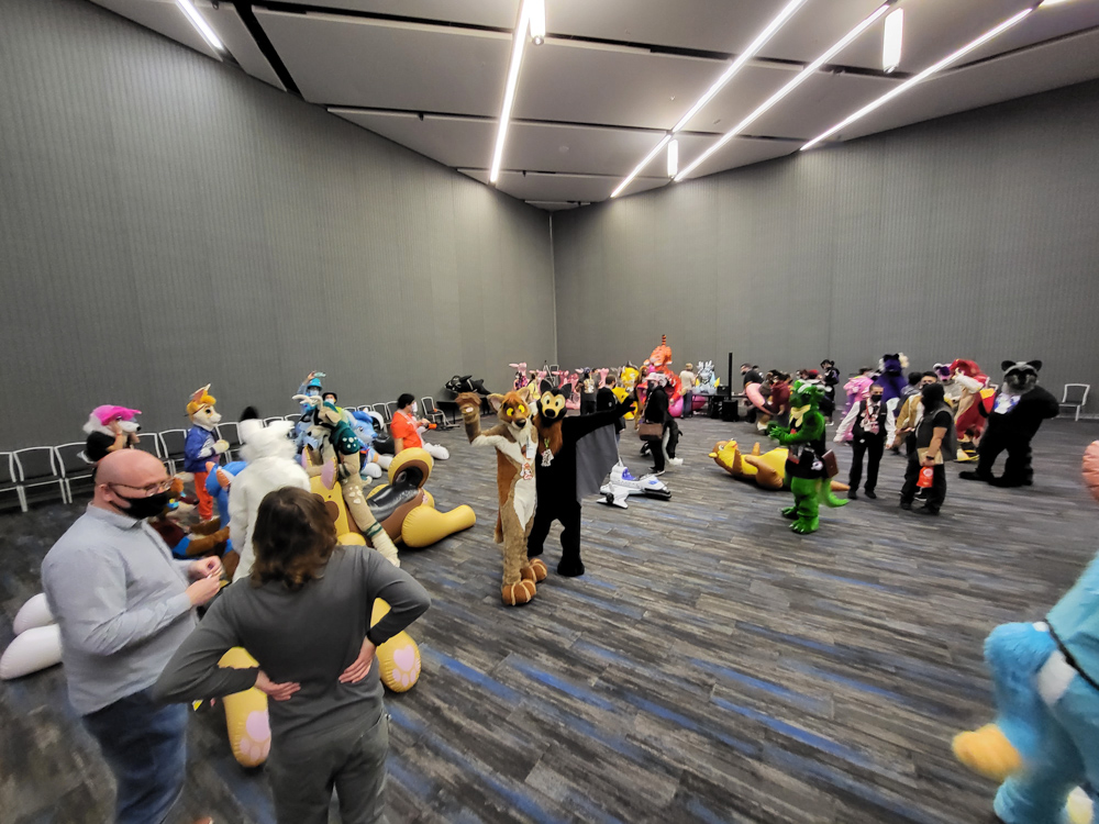 I went to the room to dump the groceries, Henrieke went to the Dealers Den in the meanwhile. Duncan was on our room getting ready to go to the parade with Byte. I waited for Henrieke to help me with putting on wingy Baseball, this was the first time I brought the bodysuit with the giant wings. It was a bit risky since the inserts and Delrin rods were too long for the luggage, so I had to bend them to fit in the suitcase. It all worked out luckily and the wings had straightened out by the time I needed the suit. Eligecos also suited up, and we went down for the parade. The parade had already started at the time, so Baseball joined the in-progress parade only to find out that he joined only a few meters from the end. So he went upstairs to do the full parade, where he met Torchi and Cami. There were lots of people watching the parade and taking photos and videos. Baseball also ran into Foxo, who really enjoyed seeing him!