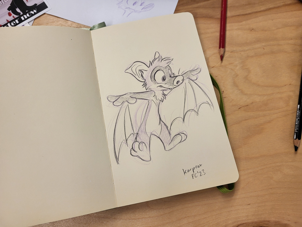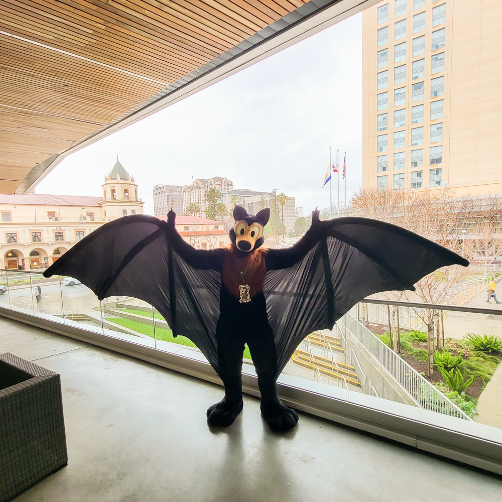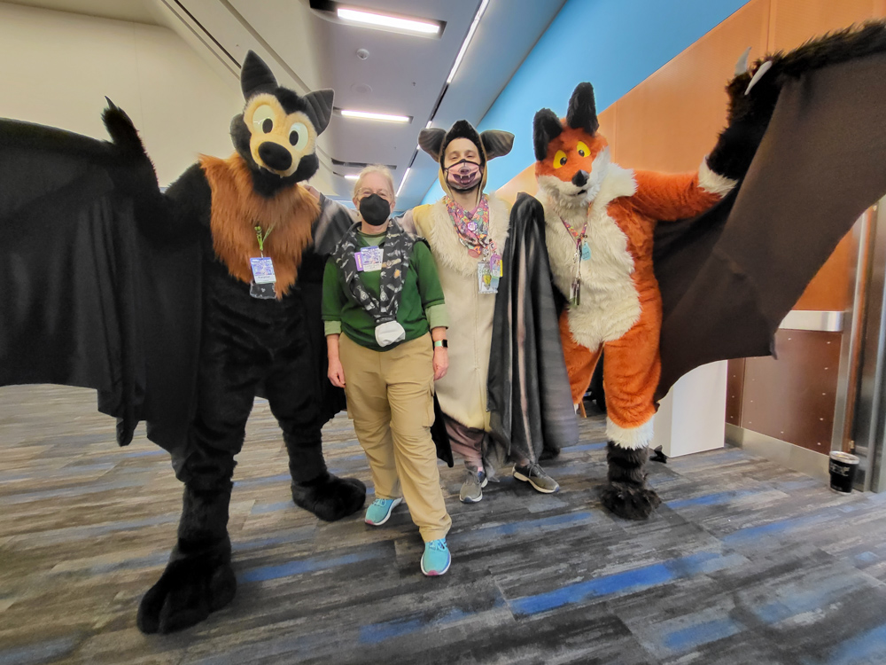 We got up at 10:00, had some ceral for breakfast on the room and then went to the bat panel at 11:00. It was held again by Corky Quirk of NorCal Bats. The presentation was great as always, and we got to see some adorable Mexican free-tailed bats, little brown bats and pallid bats up close. Zahzu, Muse, Kipper and Paco were also there. Afterwards we chatted a bit with Drek and Corky Quirk.