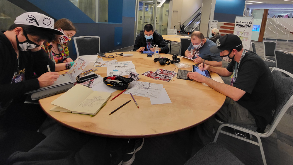 We spent some time sitting on the floor at Kipper's and Drex' booth. Henrieke did a trade with RedWulf, Royce also joined. I went to see Keovi and gave her one of our New Year's cards and bought a sticker. I also met Lockheed again, and Srice was also there. The name Srice rang a bell, and after some digging, I found out that we roomed together at a previous FC, but neither of us really remembered it. We went back to the room at 18:00 to take a break. Eli, Byte and Ronin also joined and we spent a while chatting about old Eurofurences, Disney parks and other things. Ronin showed his convention photos on the TV. They all left for dinner and I took a nap until 21:00, then we went down to artjam. It was us, Eli, Byte and Kipper.