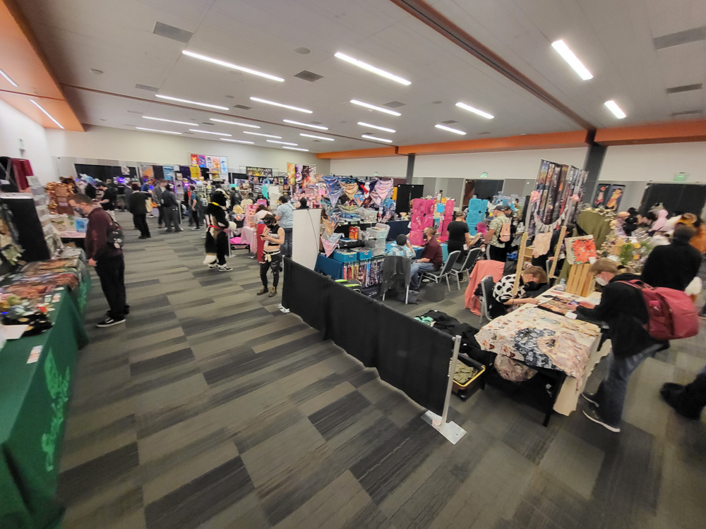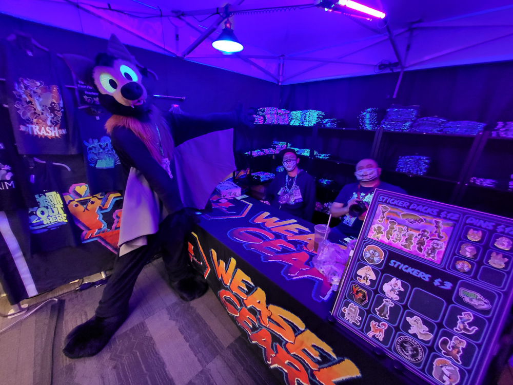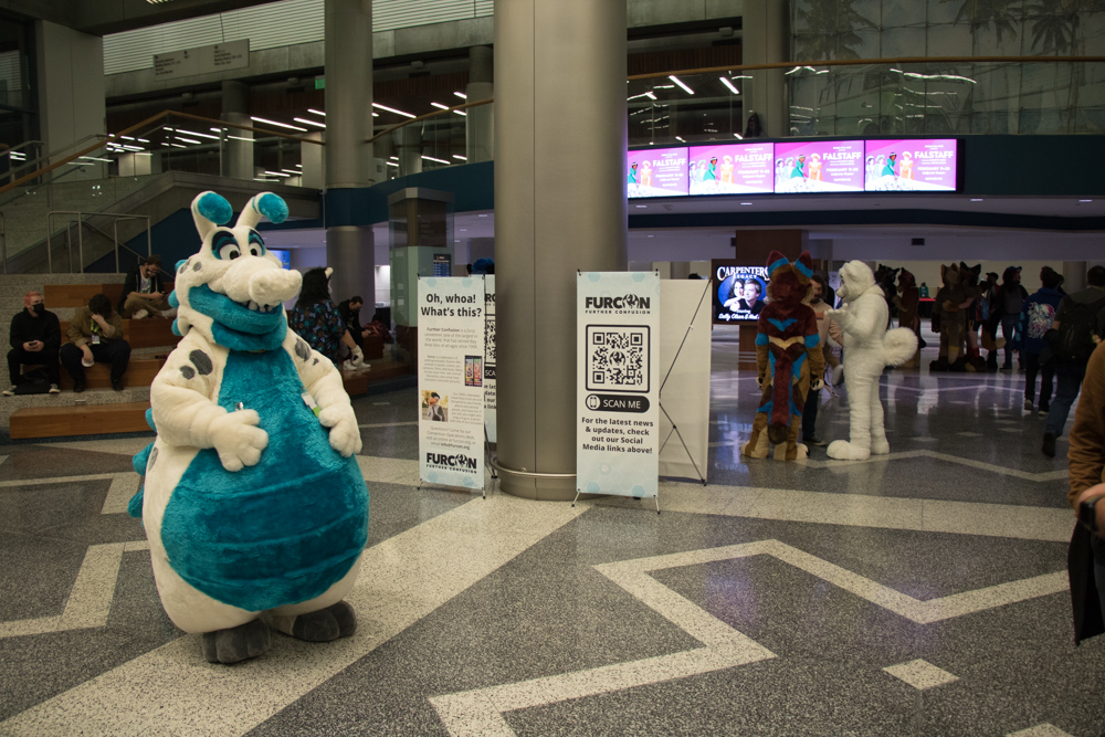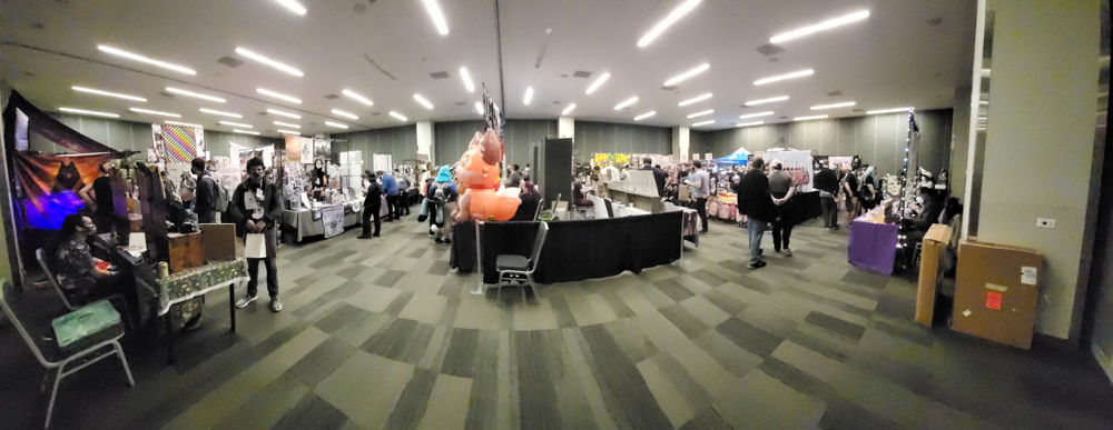 We got up at 10:30. I went downstairs to attempt to exchange the milk I bought at 7-11 yesterday, since it turned it it was spoiled. It rained way too hard however so I skipped that. In the lobby I met RedWulf, who had just arrived. I went to Starbucks in the Marriott to pick up some coffee and breakfast and met Tachi and Scruff there. I got some coffee, muffin and an emergency Red Bull and headed back to the room with Tachi and Scruff. Tachi stored his new fursuit, Torchi, in our room for now as his hotel was across the street and the forecast looked like it would be mostly rainy for the entire con. We chatted a bit while we had breakfast. I also bought a Wacom PL-400 that had just appeared in a saved search on an Austrian marketplace site, can't miss out on that! At around 13:00 I went downstairs and checked out the Dealers Den. I met Jill, Drex, Kodi, Peche and Kilmo. So many great artists there! I chatted a bit with Marymouse and then checked if there were any food stalls inside the convention center, like last time.