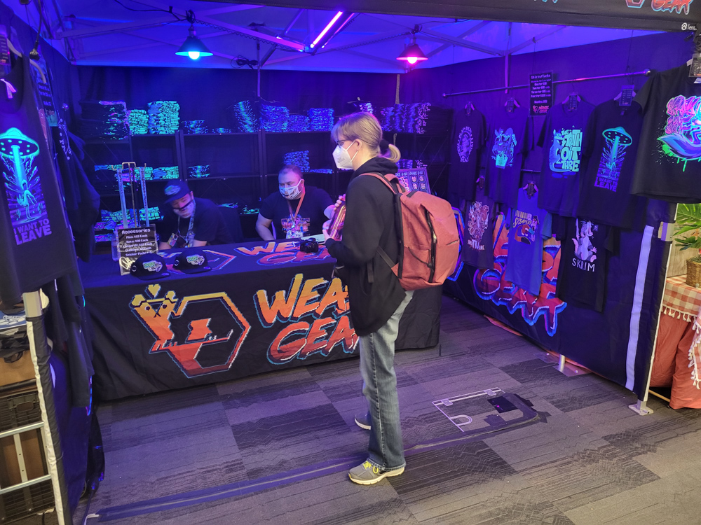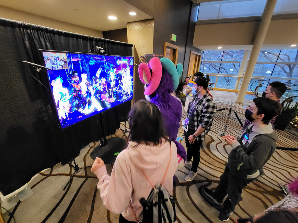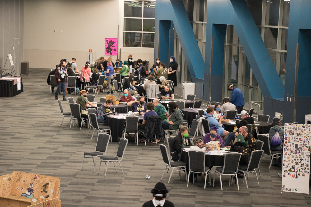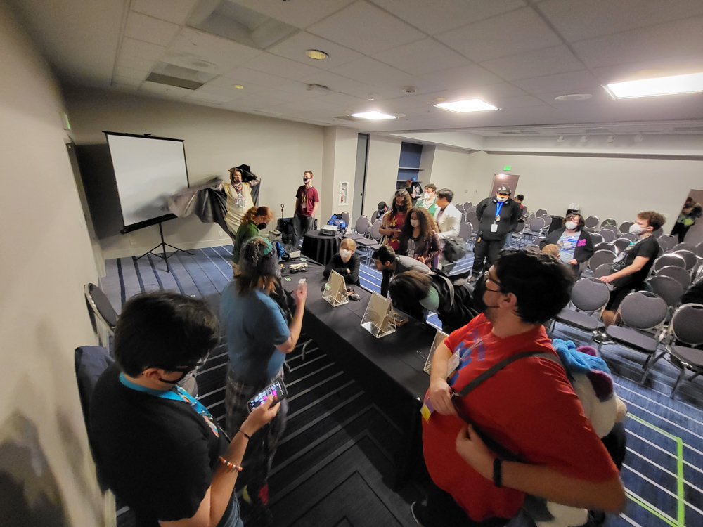 After that we took a break in the room. Byte was there and completely worn out from suiting. Back downstairs I met RedWulf and did a trade with her. Kai dropped by, who I met via Twitter since we're both into SGI computers. We nerded out about SGI for a while! JordanRhinehart was also there and recommended me Gameshop Downstairs, a nearby video game store.