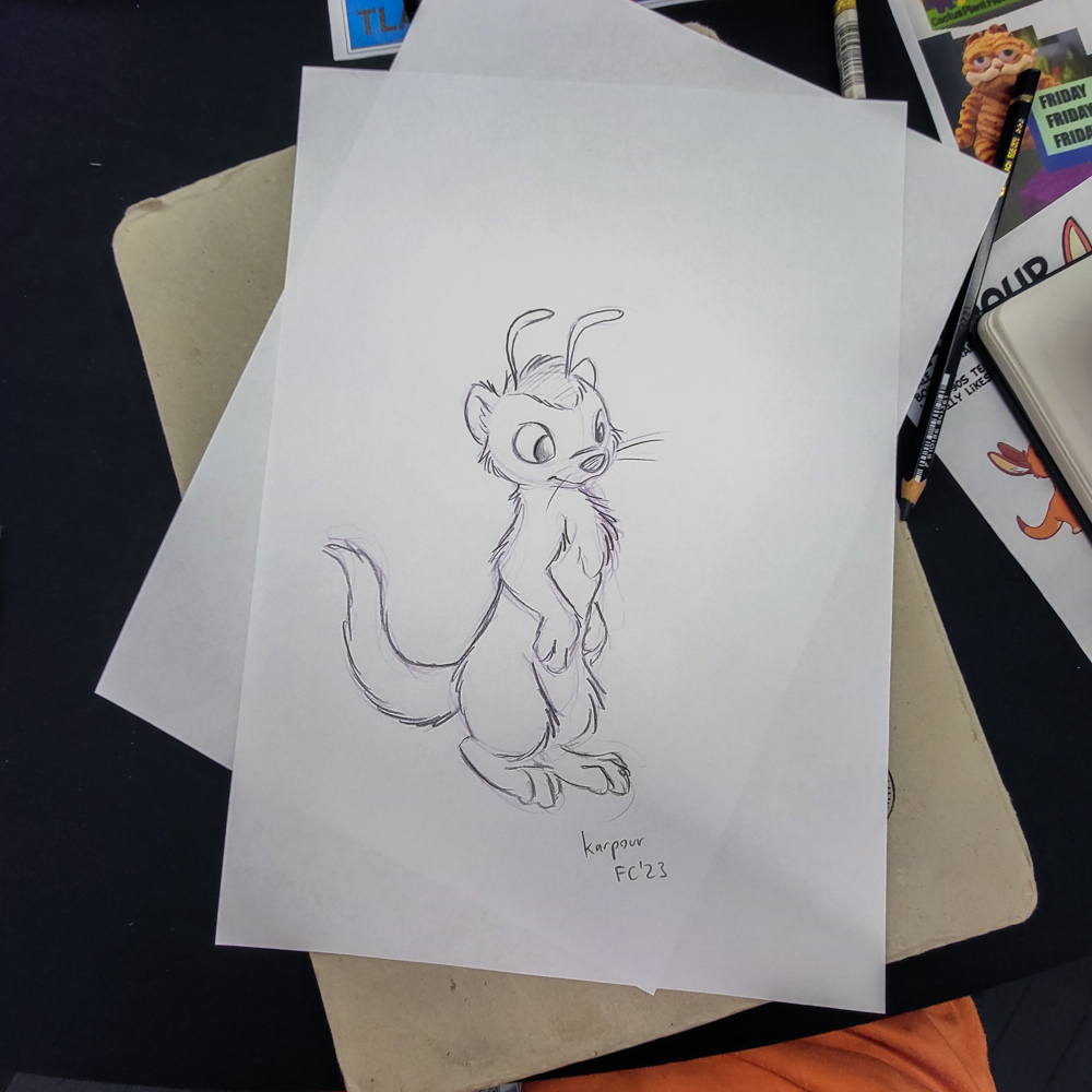 We went downstairs again at 0:45. Someone from the Tiki party joined and chatted about 3 Caballeros for a while with Henrieke. We sat together with Kipper, Drex and Geekfox. Later Vee and MrGreenface joined. I did an art trade with Vee, he was so fast that he drew me 2 sketches in the time I took to draw him one. Paco also joined, we talked about plans for Eurofurence, and he told me about his wedding plans!
