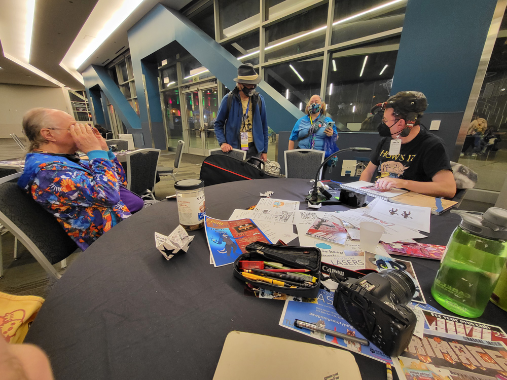 Also at the table were Rod O'Riley and Mark Merino, two of the founders of the first furry convention. We chatted a bit, I gave them one of our new year's cards and they invited us to the saturday morning cartoon breakfast on Saturday.