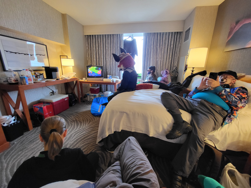 Croc invited us to a chill roomparty earlier, so we went to the 11th floor of the Hilton to a suite with a stunning view! It was Tiki themed, and Croc, Furahi, Lucky and Beetlecat were there! Bacon also joined later. Lucky fixed us up some alcohol-free Tiki drinks and we had a nice time chatting with some rainy Tiki room backdrop playing on the TV.