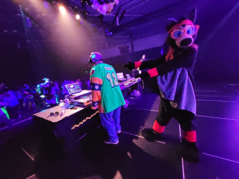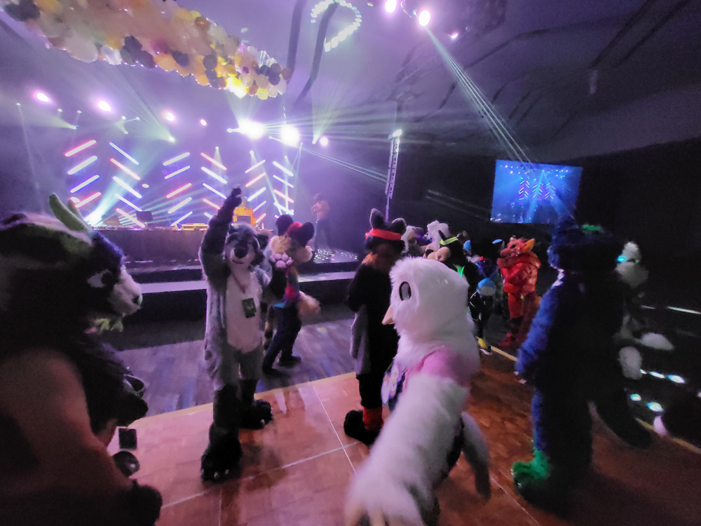 I saw down at the downstairs tables with Sysable, Rod O'Riley, Byte and Eli for a bit. I also gave a christmas card to Sysable. A bit later it was time for the highlight of the con - Croc's 80s dance! I went upstairs to get Baseball, who was at the main stage just in time for Croc's dance! Vee, MrGreenface, Raucous and HiLite were there and all had a great time dancing on the stage and the dance floor.
