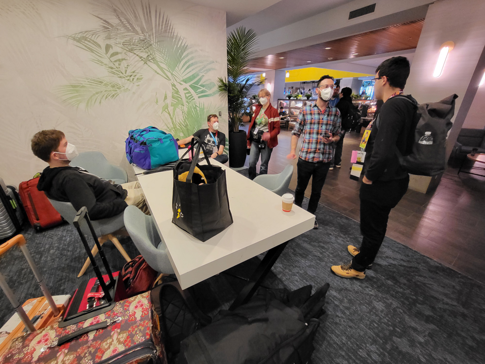 At around 20:15 we went back to the hotel and met ZotCoon at the entrance of the Mariott. We also ran into Paco and Koidel. After chatting a bit, we went to our room with Zot. He asked us to bring cheese as well as a lot of Cup-A-Soup instant soups from the Netherlands. We rested a bit and chatted with Zot, then Zot and I went downstairs again. I wandered around in the lobby a bit, and met AvWuff and Vexit, who both just had moved to Seattle. Thumper also showed up.