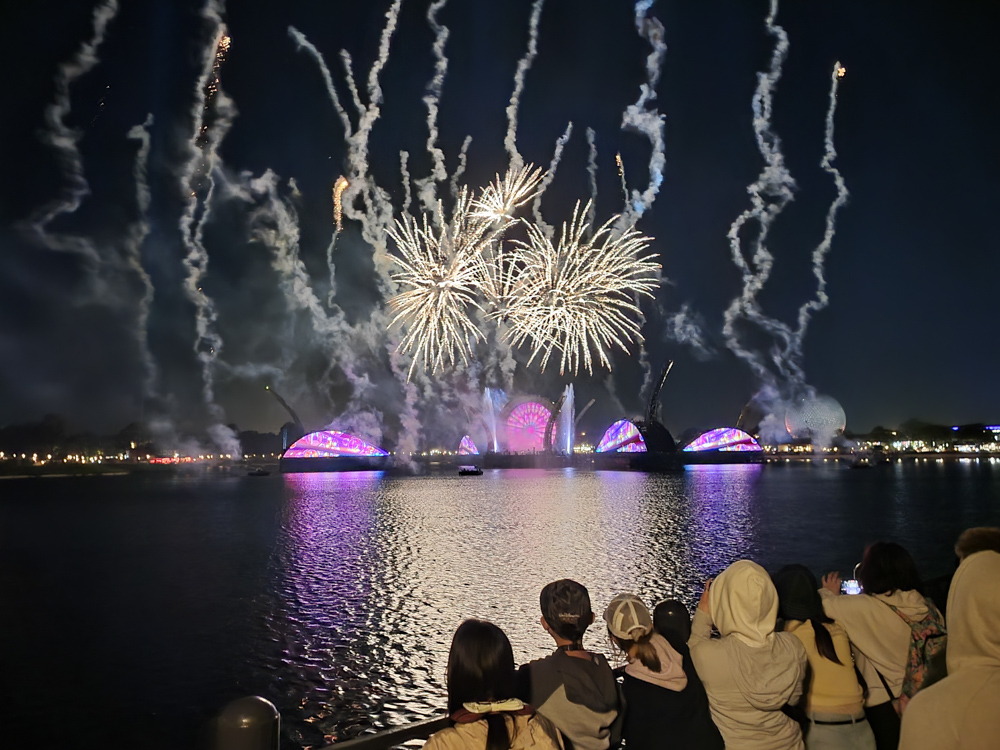 We ended up watching the Harmonious fireworks show together, it turned out that Firr worked on large parts of it. He gave us lots of interesting background info while we watched one of the last few shows before it would be decommissioned. After that we still checked out the merch store, then Firr gave us a ride back to Chorca's place.