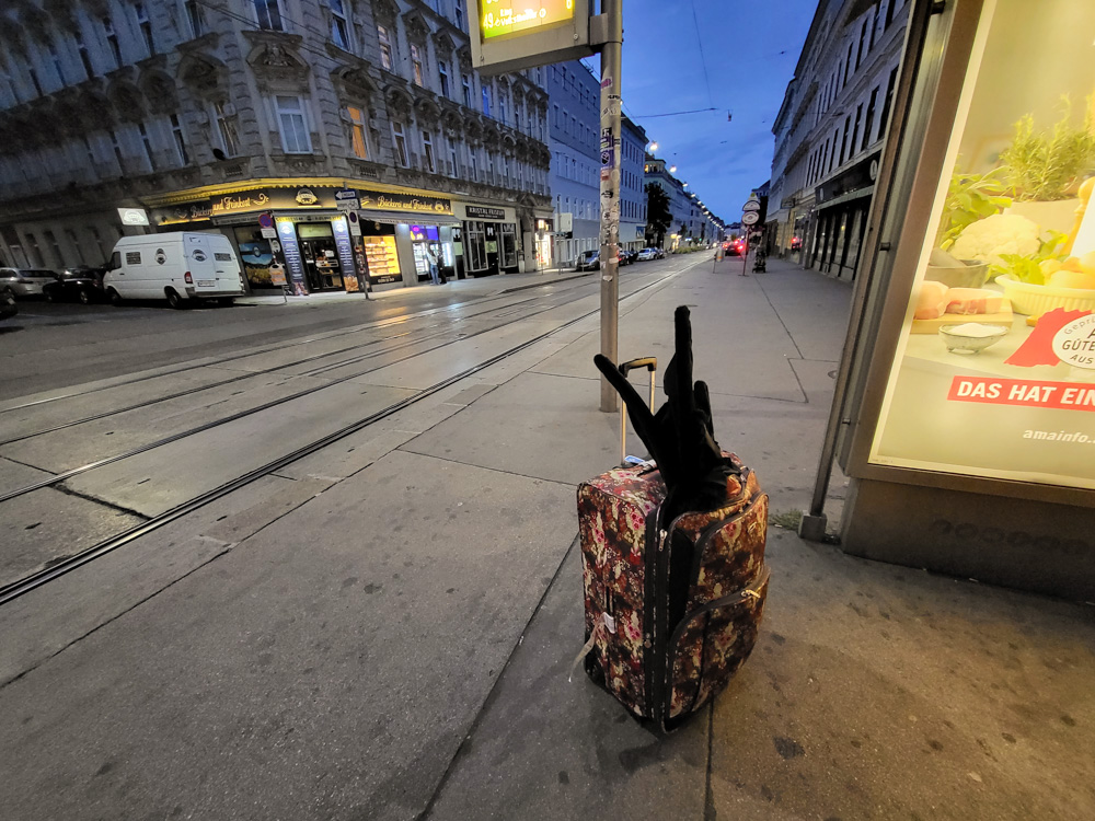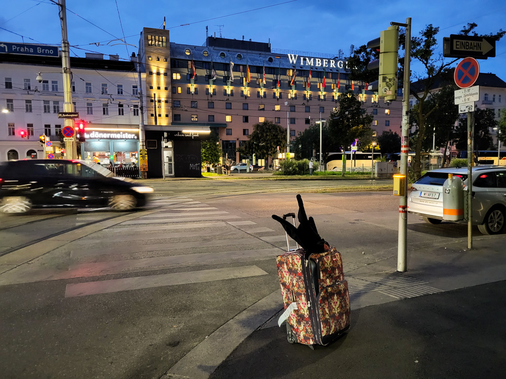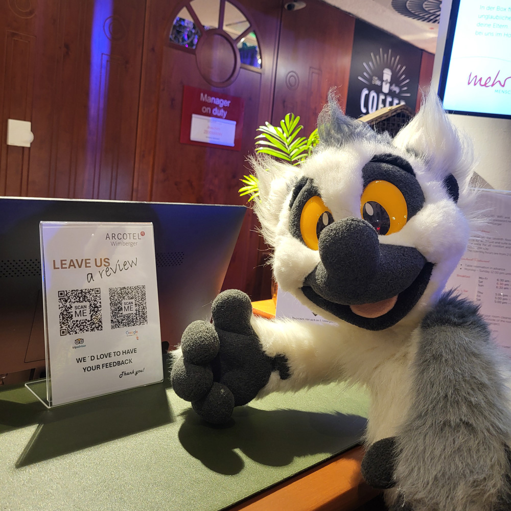 I chatted a bit with Apollo and met Birko in the lobby. I sat there a bit and finished Goddy's badge, then I met Gallen (who came all the way from Singapore!) who has been shopping in Vienna. We know each other from Mastodon, and it was really nice to meet in person. I went home again, cleaned up a bit, laminated the badge for Goddy, then I packed up the fursuit stuff and started my journey to the hotel.