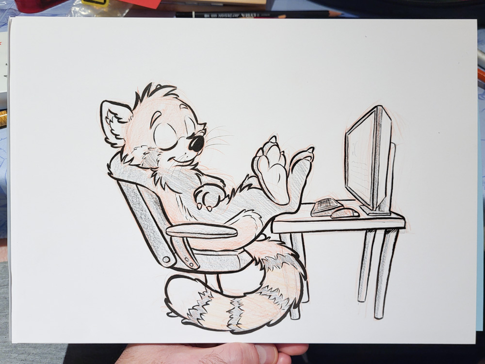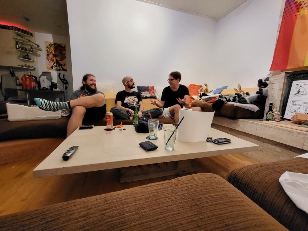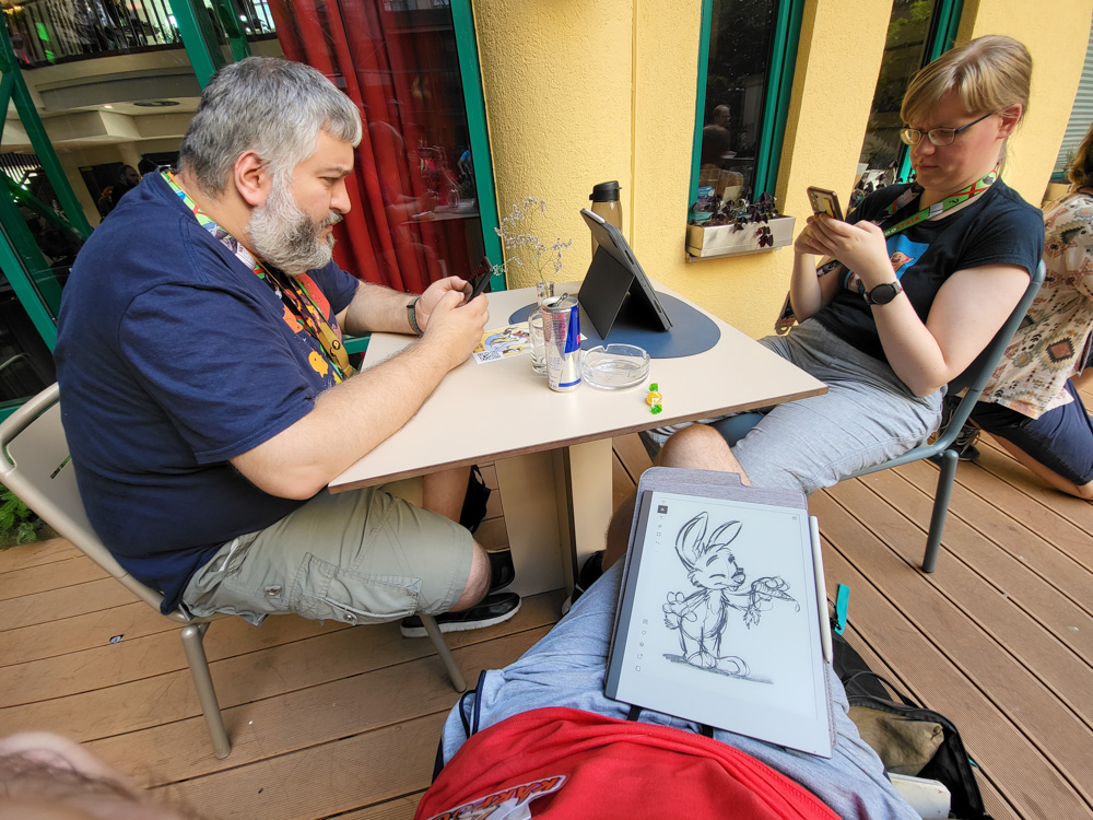 Henrieke didn't feel too well, so she went to rest in Tabbie's room. I went downstairs a bit and chatted with Bronko and CuteFluff. Satti was also there, and I made a quick sketch for him on my reMarkable. Goddy also joined, and as usual he knew everyone!