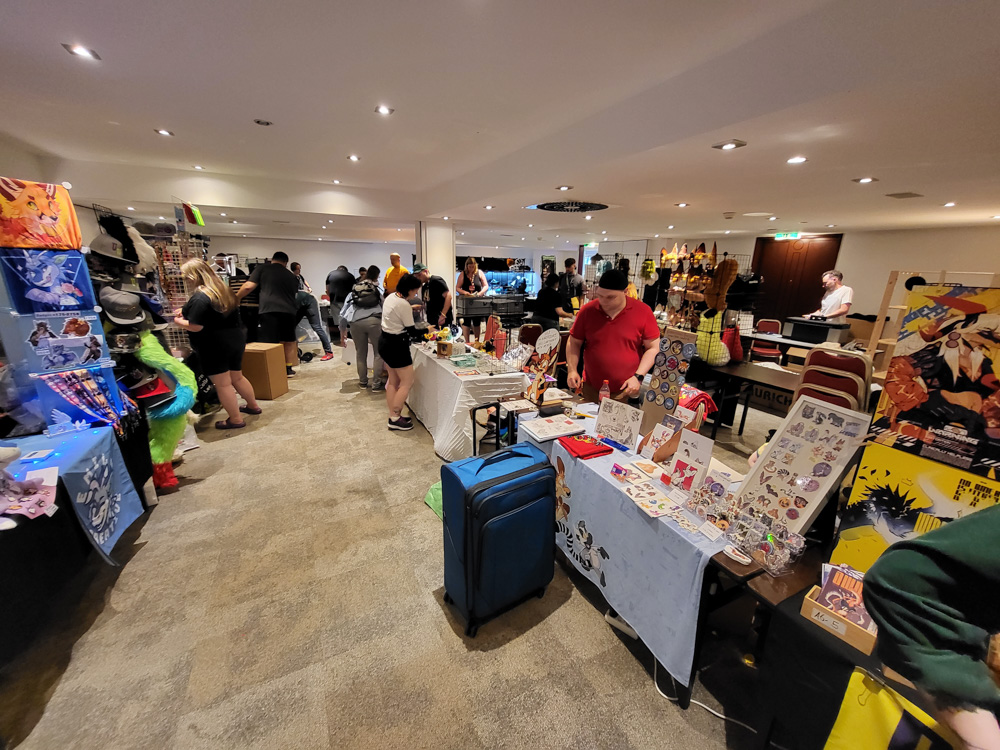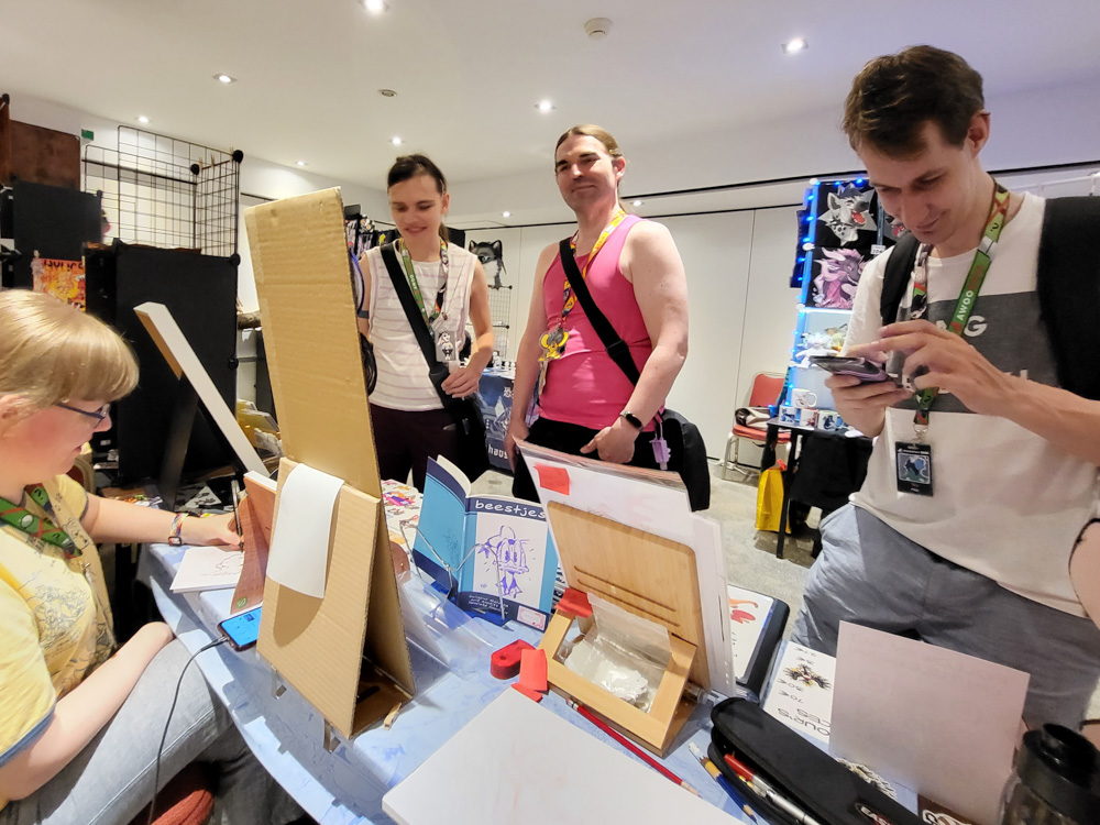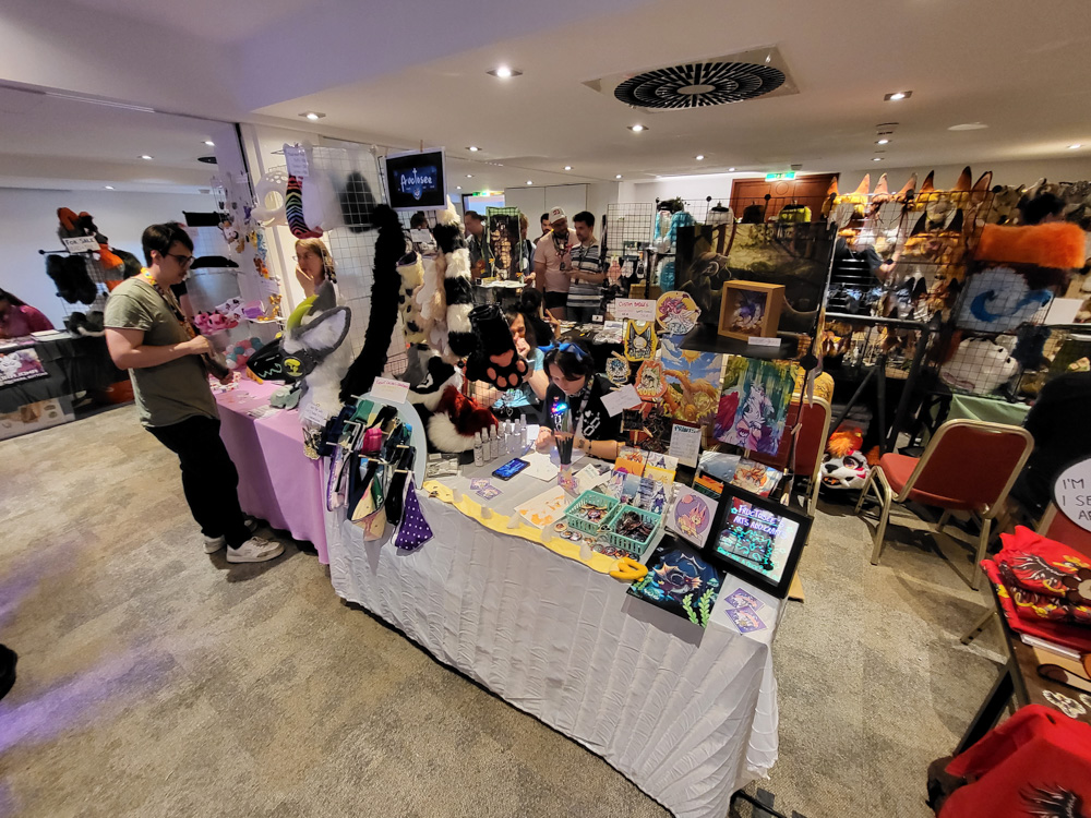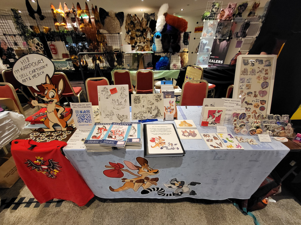 We also met Wolfmote, Spikie and Marshmallow. We dropped off some things at the Dealers Den, then went to Billa around the corner to fetch some quick lunch. Once the Dealers Den opened, we got the first influx of sponsors, which got exclusive access from 12:00 to 13:00. I sold 2 shirts, a bunch of stickers and got enough commissions to keep me busy all day. Sertro, Varimo and Atura dropped by. I also met Satti, who likes cartoony art just as much as I do!
