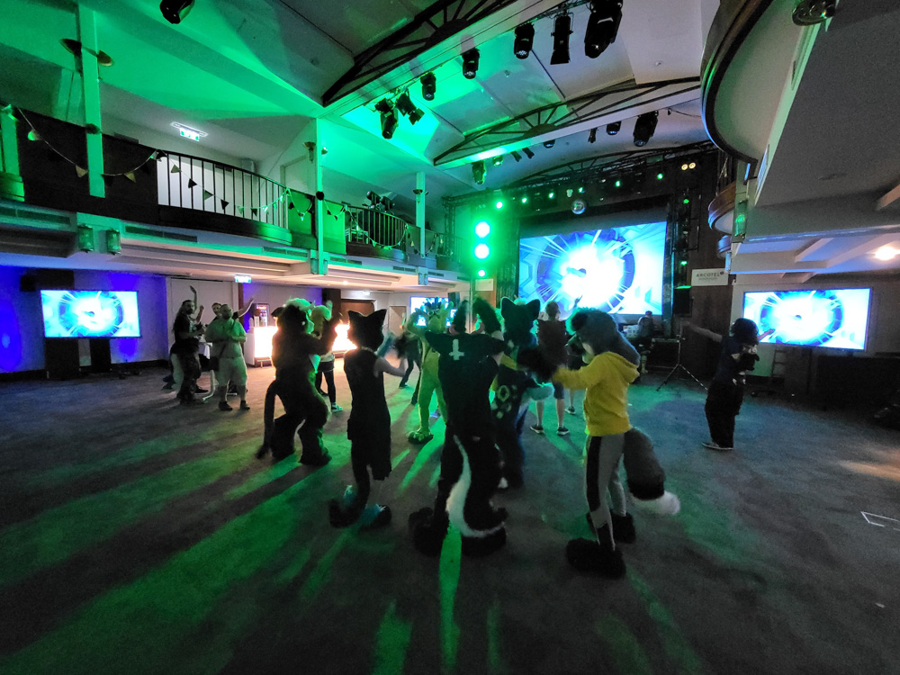 I went home and brought some of our stuff there, I also picked up a toothbrush and some essentials for Henrieke, as she stayed in the hotel tonight. Tabbie and Nico already departed tonight, so the room was free. Back at the hotel, I got Baseball and went to the dance. Goddy already waited and gave me the sad news that I missed all the corny music, like "Anton aus Tirol". Baseball roamed around in the lobby and waved to cars passing by. Goddy said bye to everyone and left. The dance had some nice progressive electro house, and Baseball met Kazzador there. After bouncing a bit, Baseball sat with Henrieke, who was chatting with Tom, the guy selling all the EzCooldown stuff. I got out of suit and went down again. Tom just left, and we chatted a bit with SilverFoxWolf about Austrian customs and his trip through Europe.