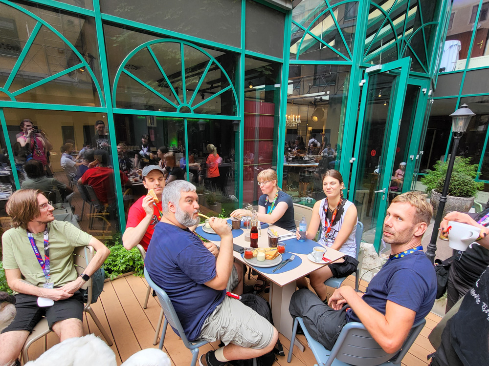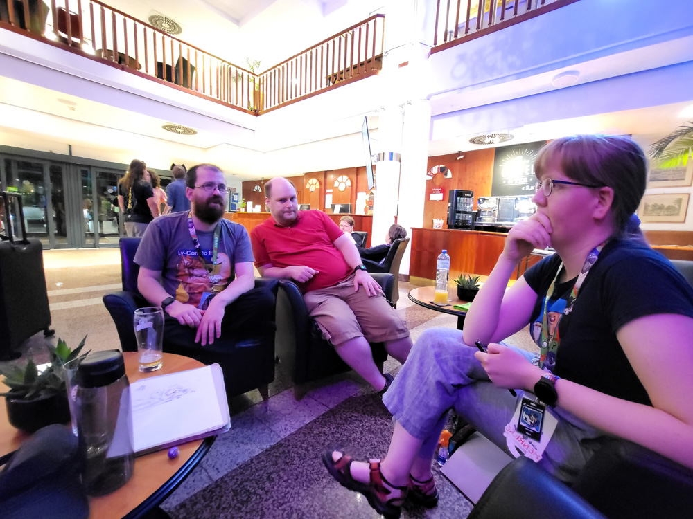 We got up at 10, went to the office and got our 30kg suitcase of Dealers Den stuff. On the way to the hotel, we stopped at Kent, the best Kebap place in Vienna and grabbed 2 Döner Kebaps. We watched cute wasps and pigeons in the park while eating, then we continued our 10-minute walk to the hotel since that was faster than waiting for the tram. We met Tabbie, Nico and Toanir at the hotel. Henrieke sat with them in the courtyard and I stood in line to get my badge. There was only one small desk, but thanks to Diego's hard work, registration was incredibly efficient. Tabbie and the others went to Wok Imbiss, I sat in the lobby with Henrieke and drew a dragon to get back into drawing a bit. Karakina came by and said hi, Tabbie as well.