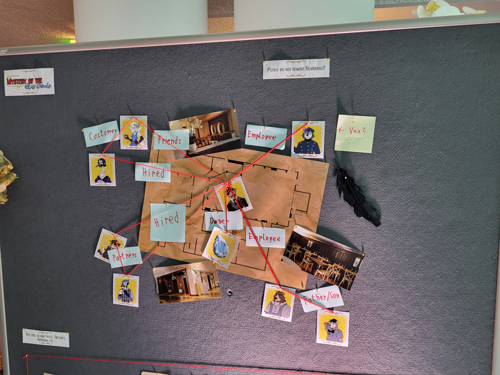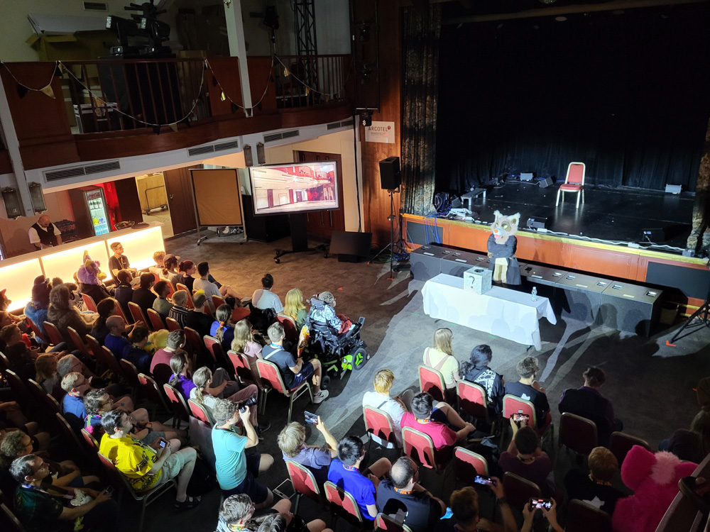 I gave Goddy his badge. The opening ceremony was postponed to 16:00, but we eventually saw it. It featured an elaborate graphic novel style game video, which was the beginning of a mystery game spanning the entire convention. Lots of cool drawings and voice acting!