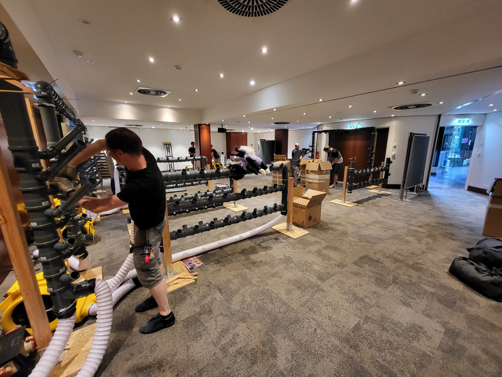 I went back to the hotel, by now the shipment had arrived and we could start assembling the pipe monster for the fursuit lounge. It was a lot of pipe-plugging and screwing. Thanks to a lot of volunteers, everything went smooth and most of the fursuit lounge was set up fairly quickly.