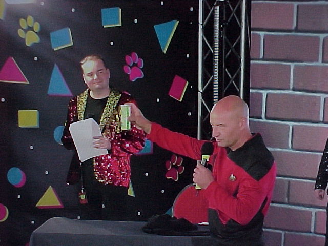 After the opening ceremony was over, we went downstairs to get our badges and conbooks from Shorty at ConOps. I said hi to Johny there, and Krauti gave me a convention t-shirt, which I made the design for.