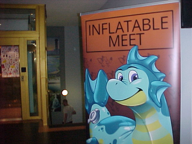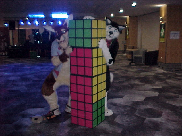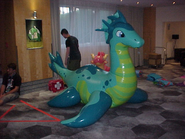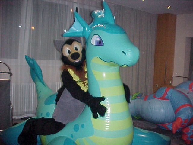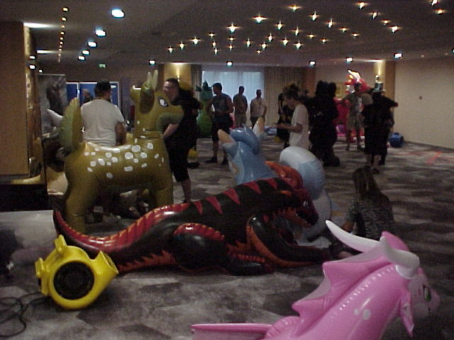 I took some breaks, and also peeked outside into the foyer, where the inflatables panel took place. When we were almost done with the head, I quickly jumped into suit, and Baseball paid a visit to the inflatables panel. Tabbie and Nico were there too, as well as several Sea Dragons! Henrieke took some photos. Baseball then went to check out the dance, which had great music!