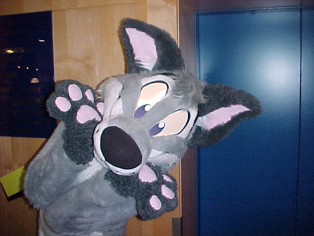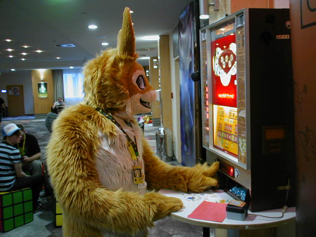 We went back to the room and ate some leftover pizza from the day before, then I suited up as Baseball for a bit. Baseball roamed around in the lobby a bit, then he checked out the very loud roomparty in the room under our suite. BBF was there, and a Cee, a nice fella from the UK.