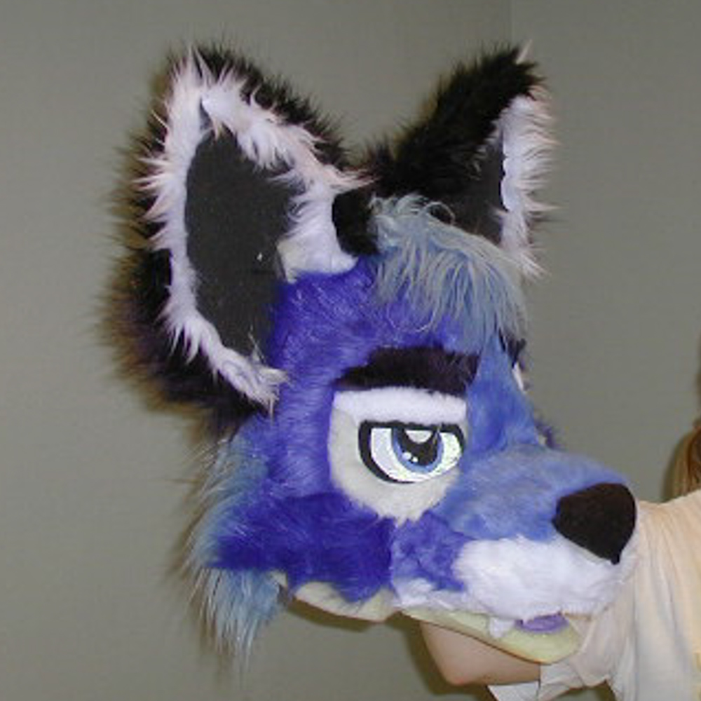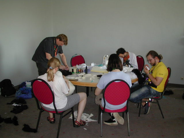 I chatted a bit outside with OtysPossum, who used my Motorola to make a call to his mom. Eiliko gave me a call, and the audio quality was great! I got a bit carried away chatting with everyone and spent a while talking with Eiliko, Fitz and Flake. I took so long that the "Speed fursuit building" panel was about to start. Henrieke, Luno and I agreed to be in a team there. Two other people whose names I forgot also joined us. The idea of the panel was that 4 teams had 4 hours to build a fursuit head out of scraps of foam and fur. The scraps were a bit small, which made things very challenging. We found some blue fur, Henrieke made up a design and we did our best. We used many sticks of hot glue and we all burned ourselves.