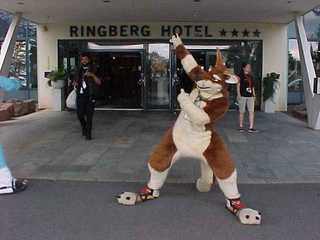 Baseball went to the lobby and encountered a group of people doing aerobics. It's great that furries spread healthy habits! Baseball watched them and joined them for a but, then I went to the fursuit lounge and chatted with Luno and Hiero for a while, tyring to convince them to visit Vienna. We chatted some more outside, then Baseball went back to the dance. The music was really hard at that point, and my energy was depleted. Baseball said good night to BBF, then I took a shower on the room. I went back to the lobby with Henrieke, and we sat together with Agent, Tabbie, Nico and some other people who passed by. I said bye to Luno, and exchanged contact info with LeeTaiger. We went to bed at 2:00.