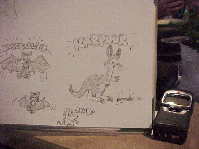 Since it was dark already, I took my really fancy Sony beamer and N64 downstairs and set it up, projecting on the bar tent. We played some Mario Kart and Diddy Kong Racing with Henrieke, Kairan and Shorty there. BBF also dropped by. Hiero, Jipho and another friend of theirs also played a bit. I packed my things up again after a while and brought it to the room, then went back to the lobby where Henrieke was sitting with Agent, a really amazing artist we saw earlier in the Dealers Den. We sat together and chatted while Henrieke drew a picture of Martin the Marten, the inofficial hotel mascot.