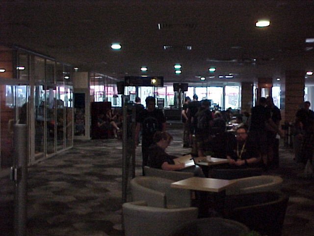 I went back down, met Tabbie and Nico and we got some food after waiting 30 minutes in a huge queue. We sat outside, and I wrote some SMS to BBF. Then Henrieke and I went downstairs to see Agent. I also chatted with Flake a bit.