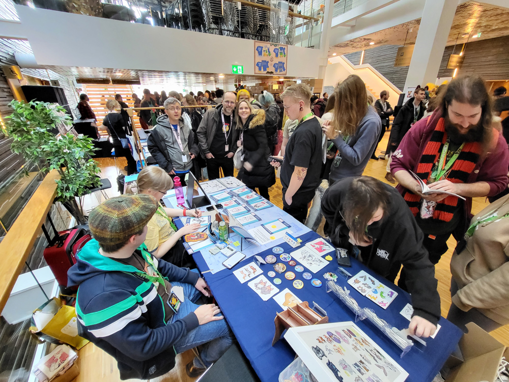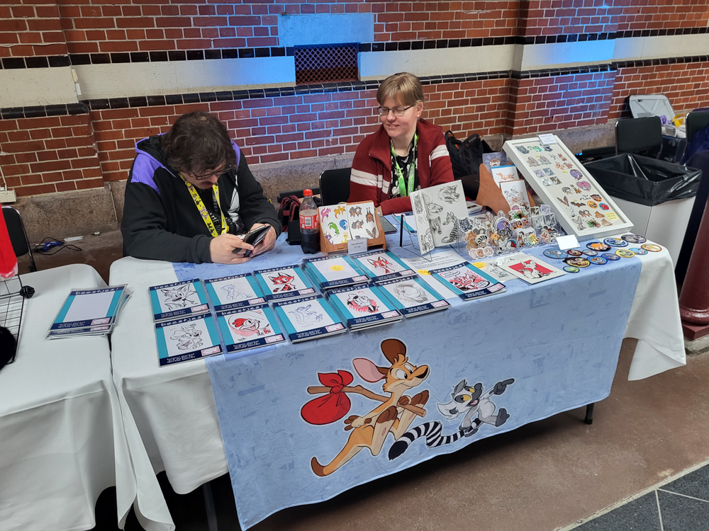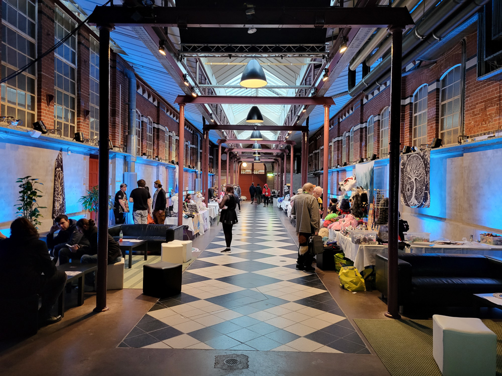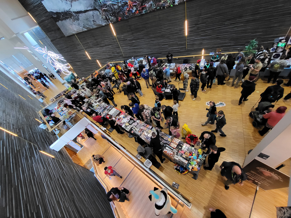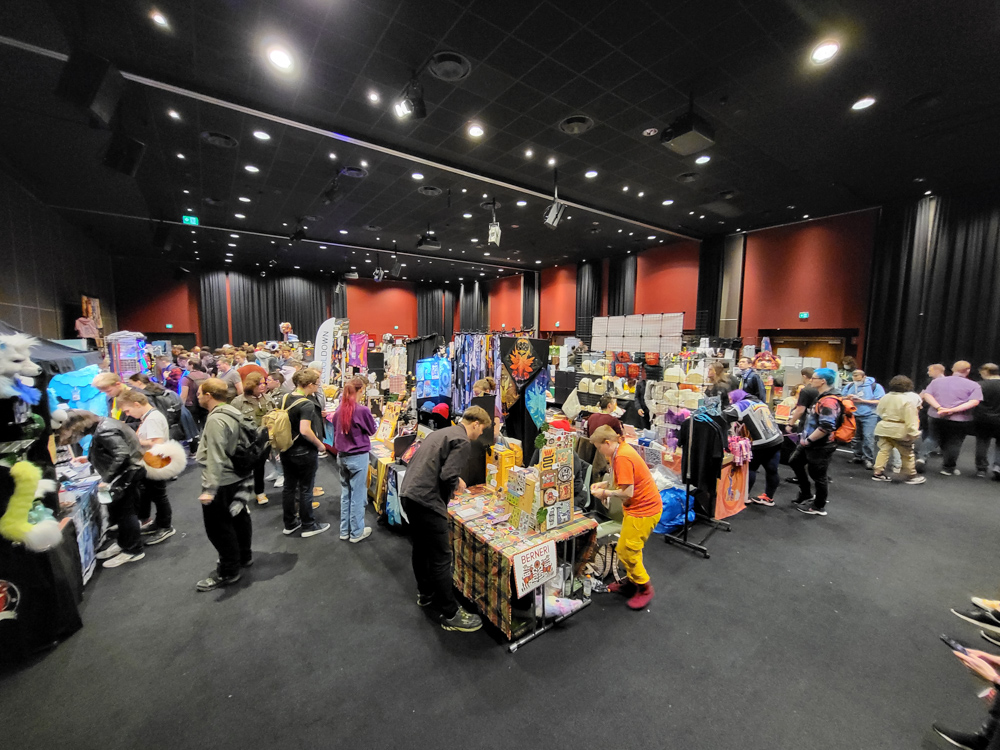 Henrieke went to the room and I hung out with Steel and Paco a bit. I went to luggage dropoff to check out the banner I made for it, but sadly they ended up not using the roll-up banner as a part was missing. I went back to our room to meet up with Henrieke and packed my art things, then we went to Valhalla, the overflow location, which was a 10-minute walk from the hotel. As the convention grew to 3600 people (bigger than the previous Eurofurence), there was simply now enough space in the Clarion, which has fairly limited space for panels and no dedicated Artist Alley space.