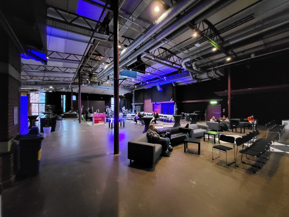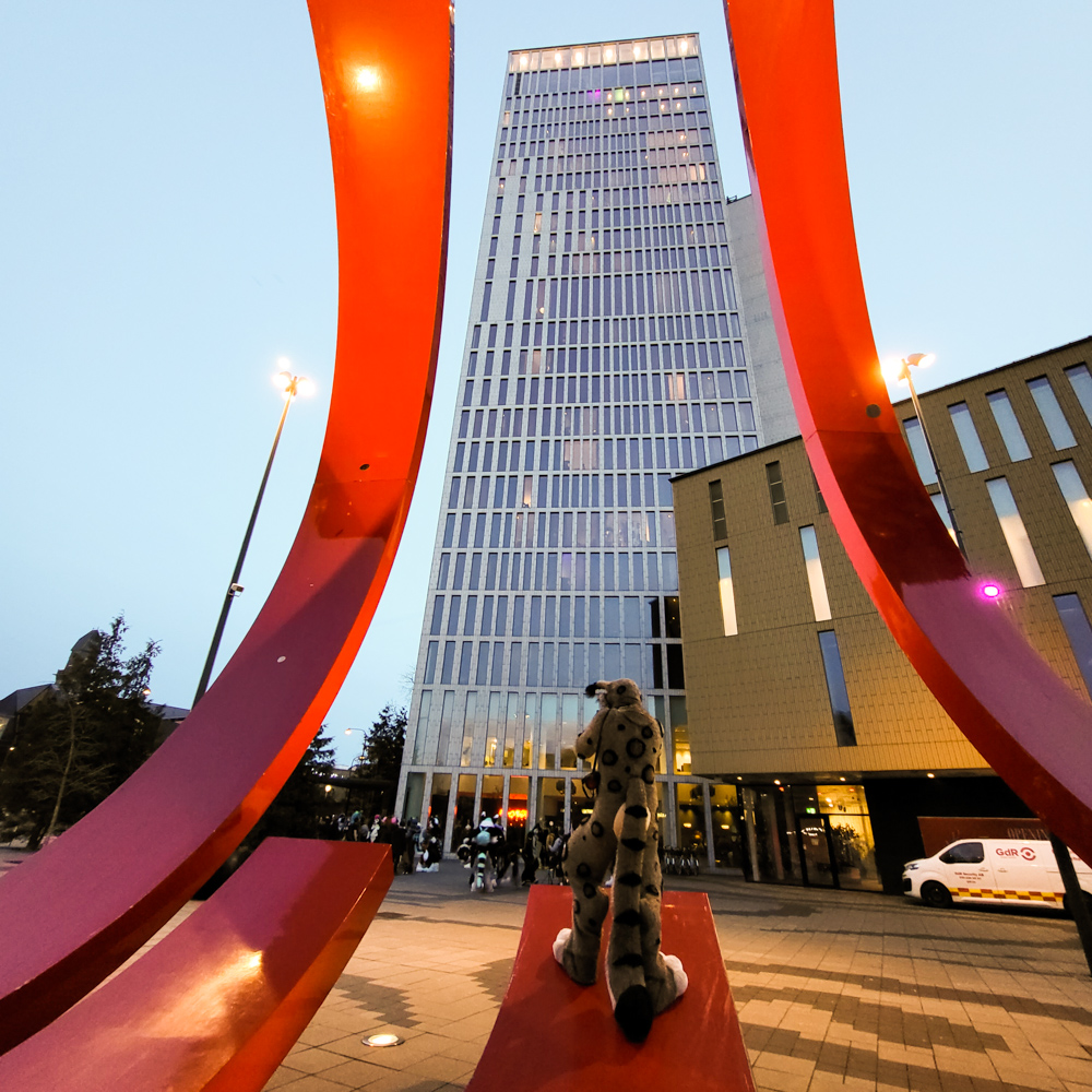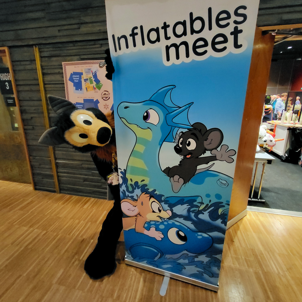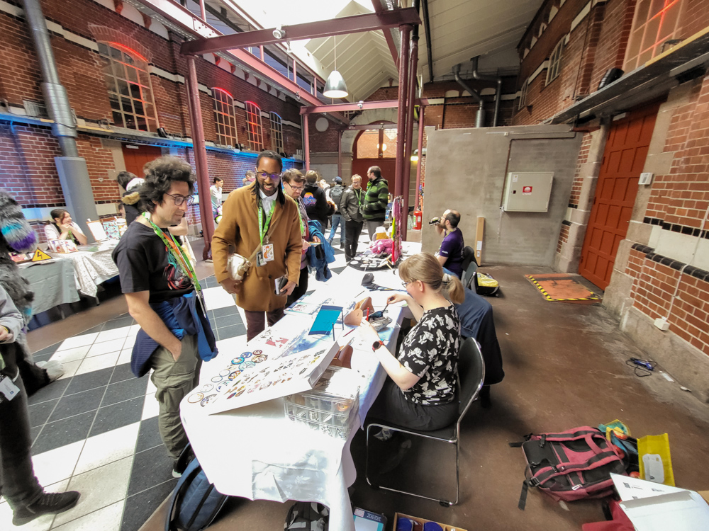 Henrieke went to the room and I hung out with Steel and Paco a bit. I went to luggage dropoff to check out the banner I made for it, but sadly they ended up not using the roll-up banner as a part was missing. I went back to our room to meet up with Henrieke and packed my art things, then we went to Valhalla, the overflow location, which was a 10-minute walk from the hotel. As the convention grew to 3600 people (bigger than the previous Eurofurence), there was simply now enough space in the Clarion, which has fairly limited space for panels and no dedicated Artist Alley space.