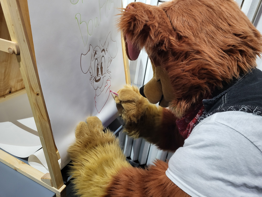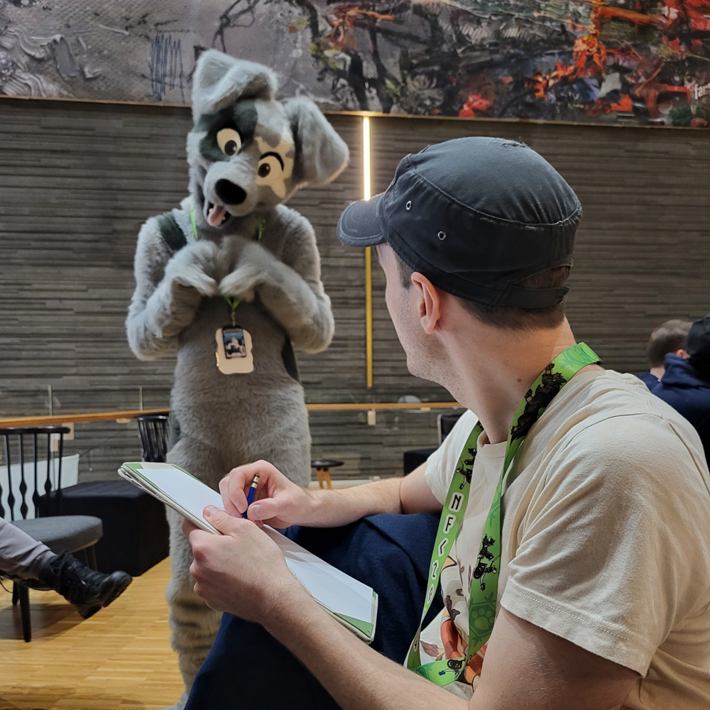 I went back to the Artist Alley at 16:45 and helped Henrieke pack up. We got some pizza at the central station and picked up some snacks (holy crap, groceries are brutally expensive!). We also picked up some dinner for Skippy, who was quarantined on the room due to feeling sick. Back at the hotel, I delivered food and a COVID test to Skippy, then I went suiting. Henrieke followed soon after. Baseball said hi to Koidel, who was sketching in the Artist Lounge, then he joined Paco and Steel at Doodles for Donations and drew some stuff for charity.