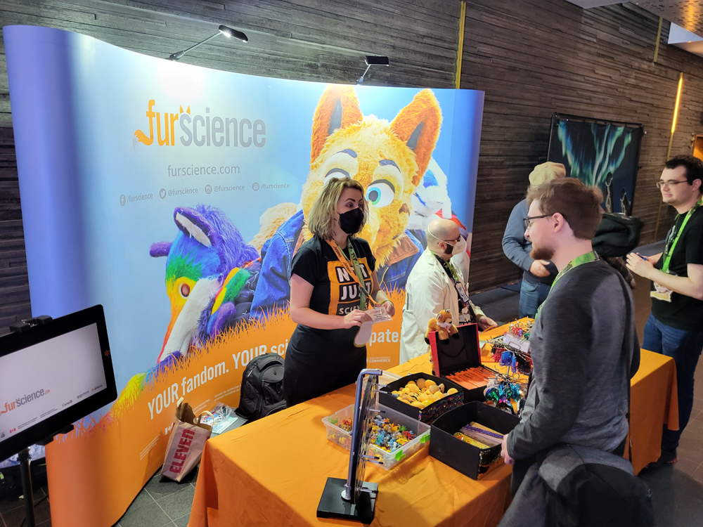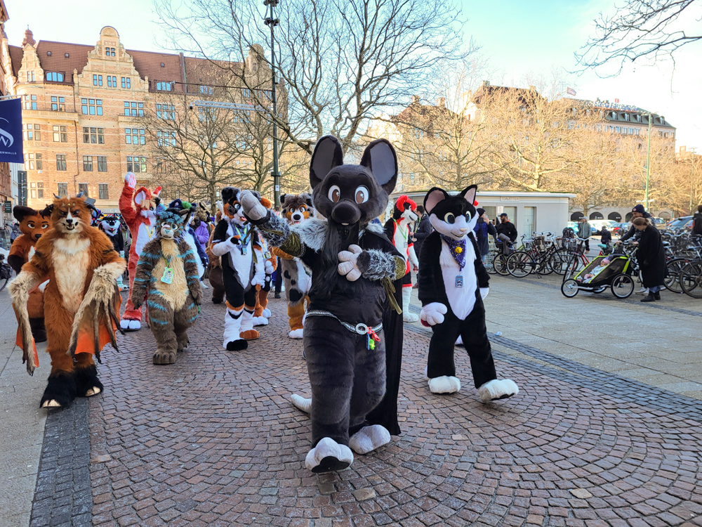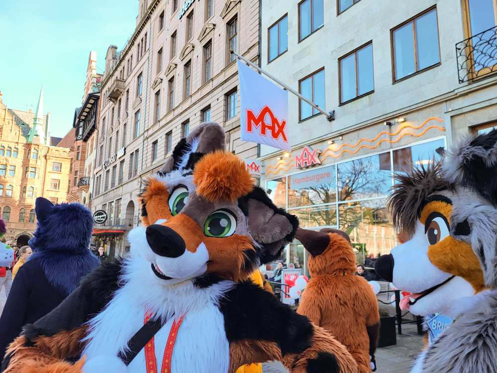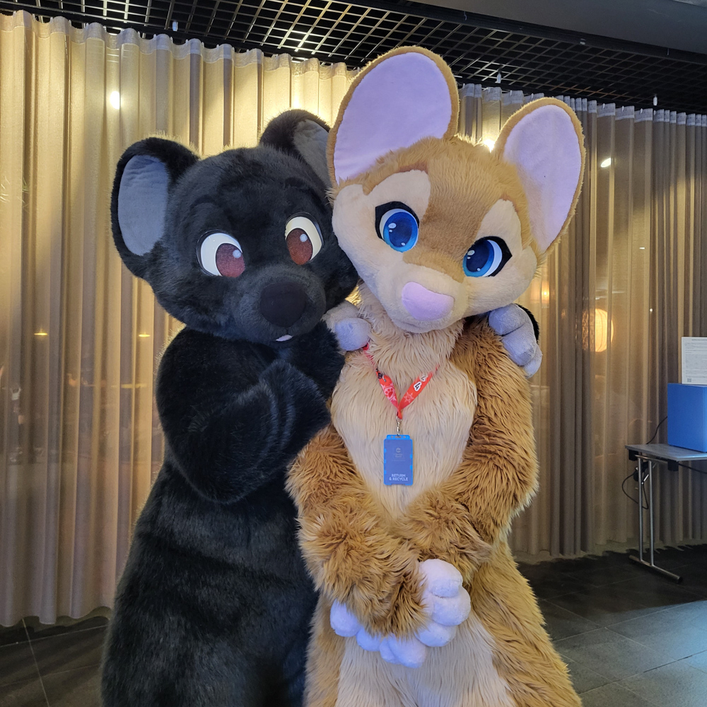 We chatted with them for a while, and I tried explaining Surströmming to Dante. I also spotted Luno and Hai. We wandered around, saying hi to all the people we knew and then tried our luck at registration. After an hour of standing in line with Skippy keeping us company, it was our turn, sadly it turned out that we forgot to upload badge images and fursuit badges. Henrieke met up with Verdonia and picked up 5 pairs of her socks that she designed for the super sponsors, which turned out fantastic! We also ran into Shorty who was busy as always!