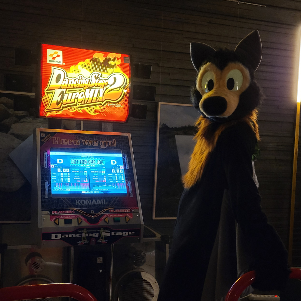 I brought our jackets to the room and picked up Henrieke's sketchbook, but decided it was time for some suiting. So Baseball went down. Sadly the line for the dance was endless, so no chance there. Baseball played a round of DDR instead, and went to the room soon after. I left the suit in the fursuit lounge and went back to the art jam. I traded with Paco and Neop came, we chatted for a while. Henrieke showed Hupie comics to Steel and Paco.