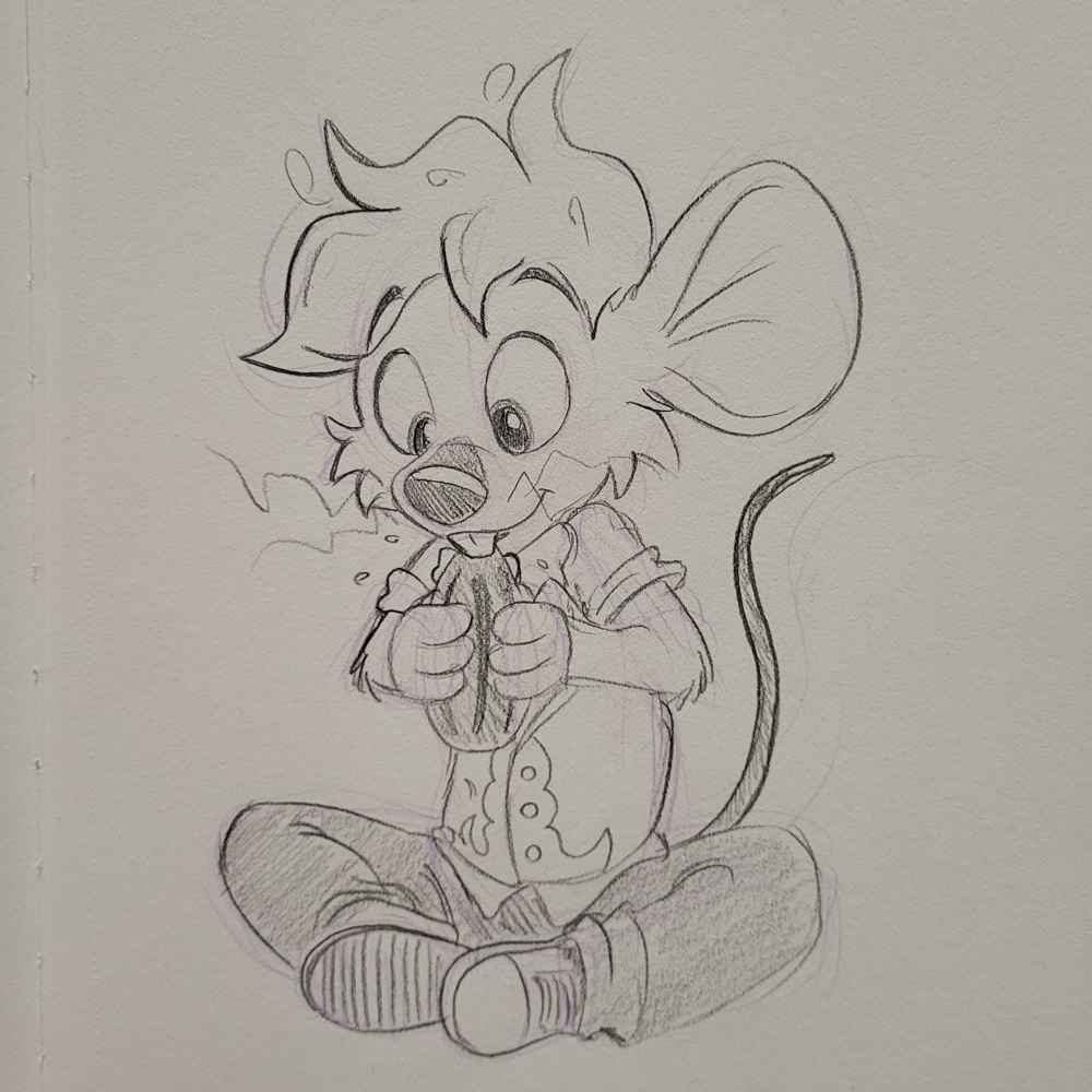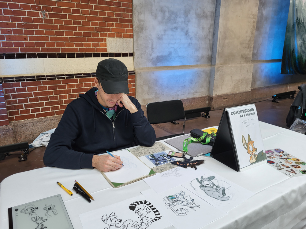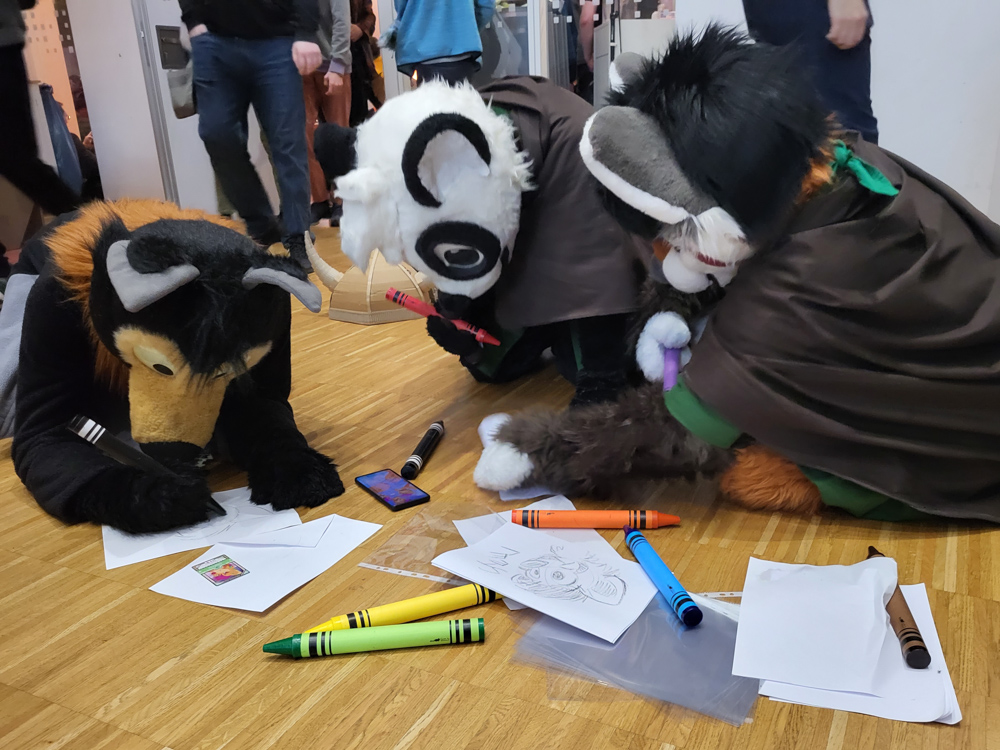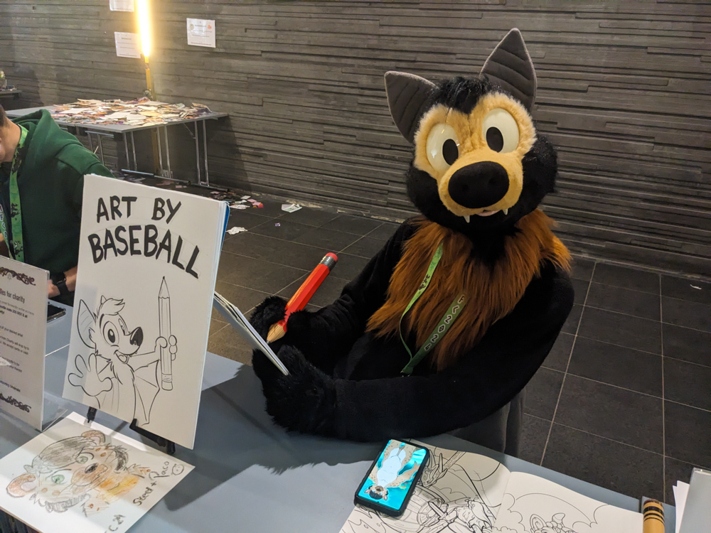 Skippy, Ethan and I went to Max to get some burgers. Ethan stayed, Skippy and I brought the food back to our room and had it there while watching surreal furry student films on the TV. I went to the lobby with Mag at 18:00 to stand in line at Kéké's table to get a charity sketch. Sadly after almost an hour there were still 3 people in front of us, but Baseball's slot was at 19:00, so I had to bail. Luckily Kéké and the person behind us in line was fine with Mag taking my sketchbook. Baseball arrived a few minutes late and did 7 charity doodles at 200SEK each!