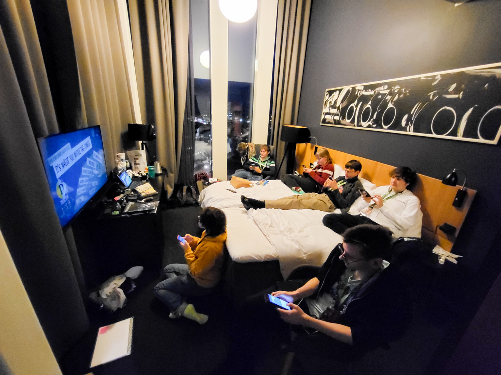 On the room I found out Henrieke tested positive for Covid, and after taking a test, I was positive too. Neither of us had symptoms. Luckily I had tests and very good FFP2 masks with me. Ethan was nice enough to pick up some Vitamin D, masks and tests for our other friends for us from a pharmacy. I went and got us some waffles from the hotel bar, which turned out to be a mistake. The dough tasted.. bad. Would not recommend. Sadly there weren't any snack options in the hotel, apart from the dinner buffet and late night hot dogs, for which it was too early.