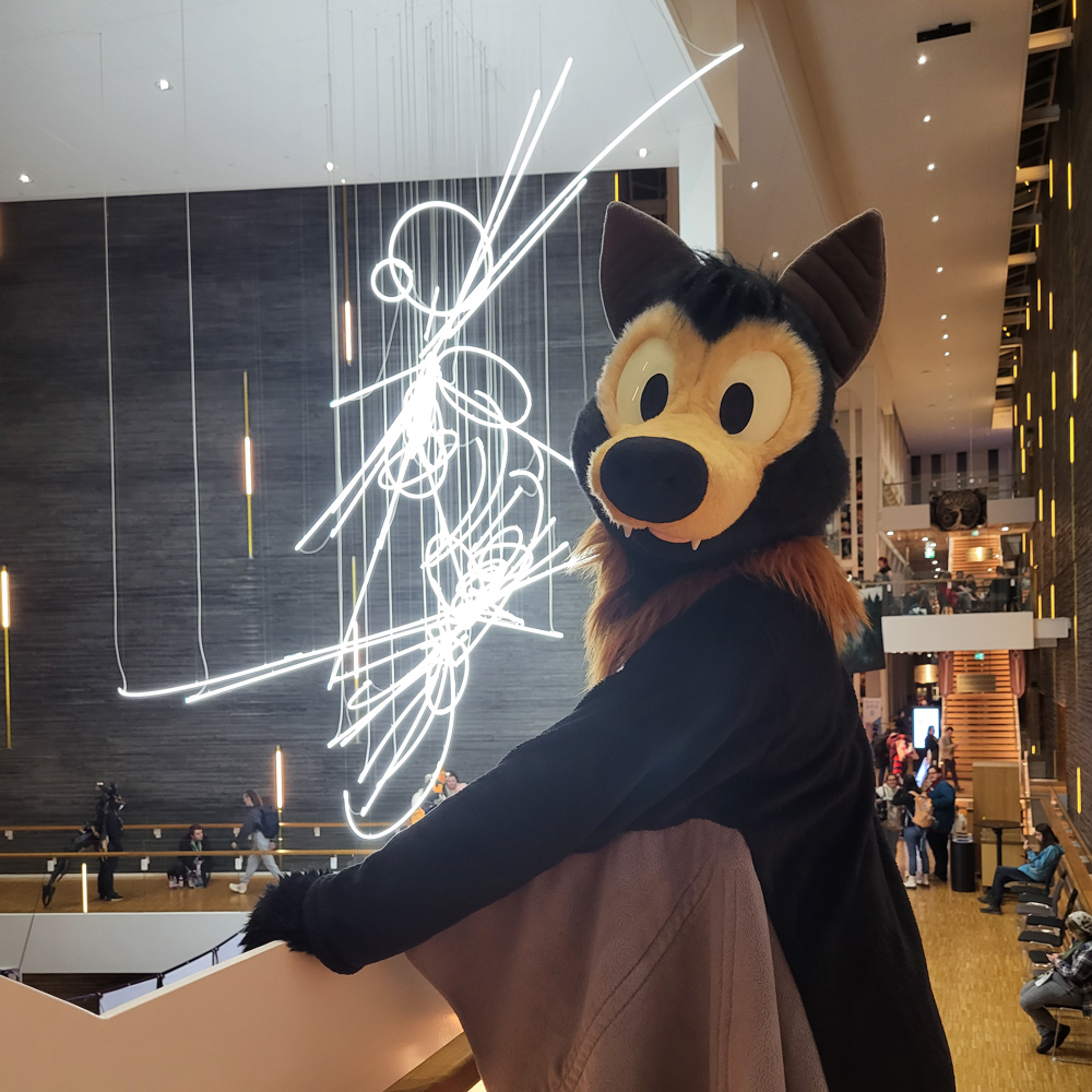Baseball did a quick round in the lobby and then went back to the room again. Sadly Henrieke wasn't feeling too well. I went down again to meet people. I met Mag, Flint and Icky as they were watching concert-goers reacting to fursuiters. (There was a concert going on in the big concert hall, and to get there people had to walk through the convention space). I chatted with Dante, JD and Mag for a bit, then went upstairs and ran into Koidel, who was trading with NikRaccoon. Kazan, Paco and Steel also joined, but they quickly left to grab food. I used the time to pack our things on the room, then went back downstairs and met Icky, Flint and Ekorren in the Artist Lounge. I chatted with Icky about oldskool DnB. Paco also came down and tried to convince me to come to Confurur, a convention in Guadalajara, Mexico. I did a collab with Paco, then went up to the room at 0:30. After packing a bit more and steaming, we went to bed at 1:30.