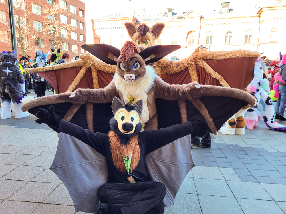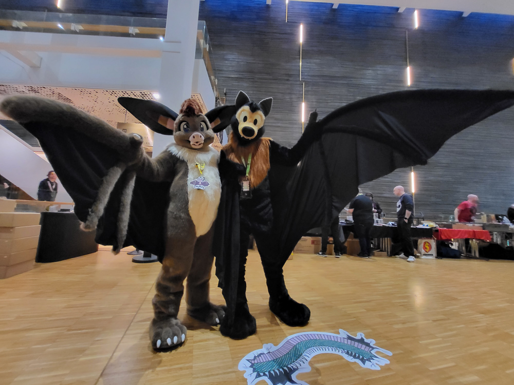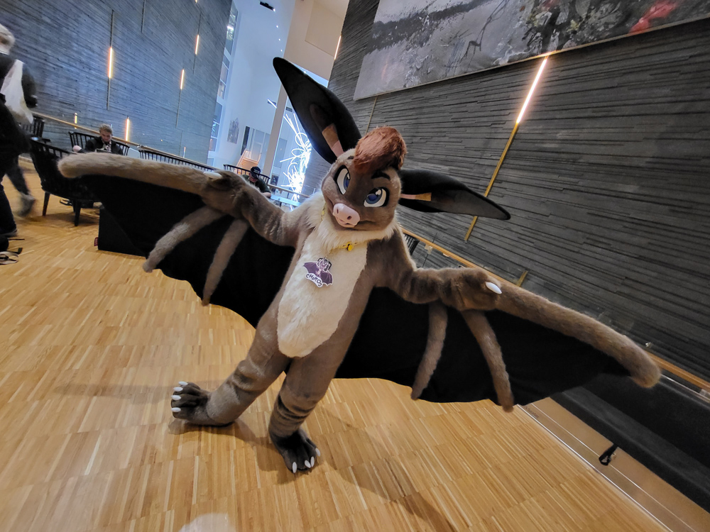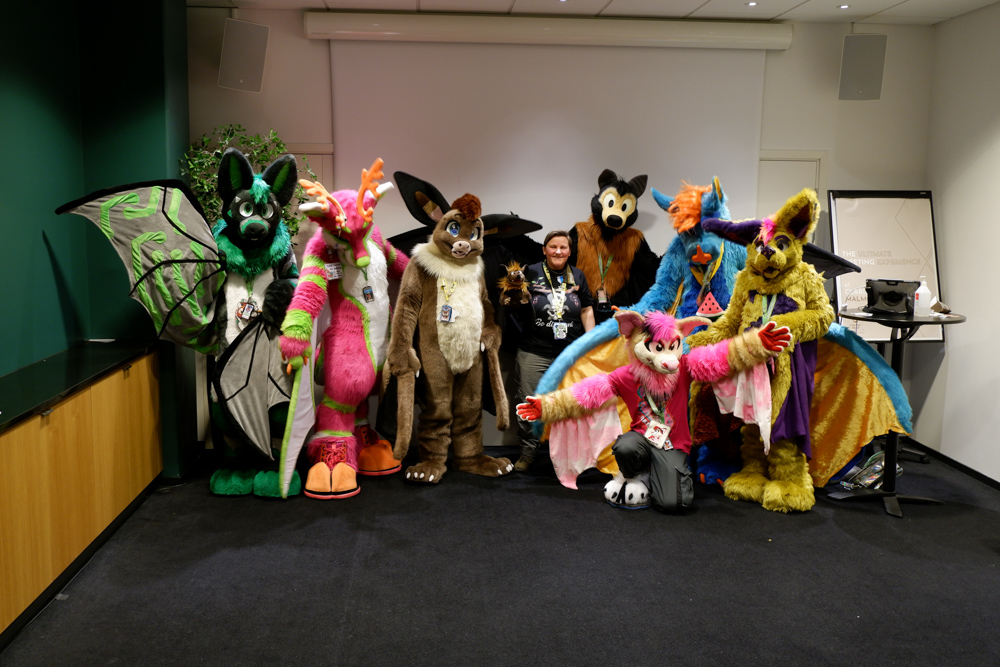 I found out that Kiguren was at the con, so I went to meet her in the fursuit lounge. I also met Dice on the way. Then it was time for me and Chiros to suit up for the Bat panel. Both Chiros and Baseball said hi to Henrieke before going to the panel. Baseball took a detour and entertained some kids who were there for the open house event. The Bat panel was nice, though it was exhausting to listen to it while suiting. In the end we did a group photo! It was also great seeing Neop's fantastic bat suit there!