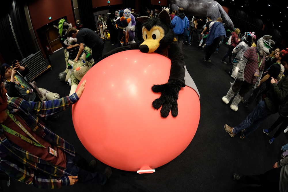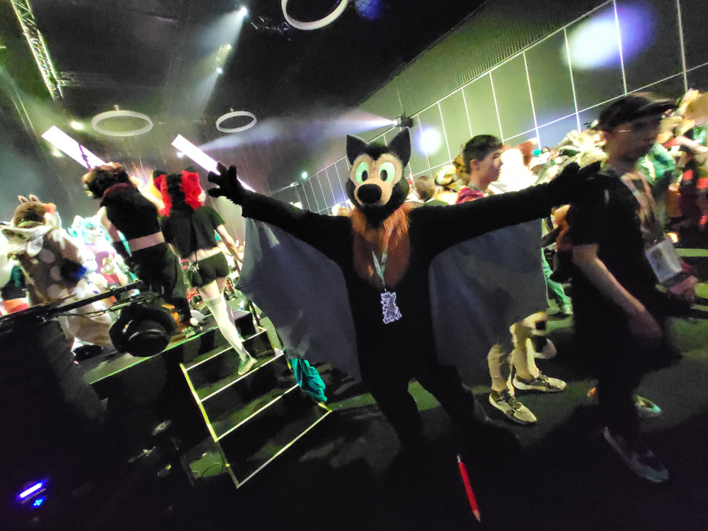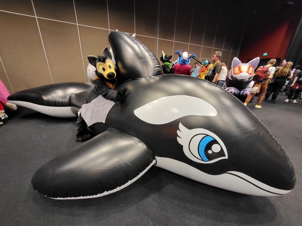 We watched Furovision on our hotel TVs, which was a nice event. I went downstairs and picked up another pair of the socks she designed, then met Mag, Levi and Icky. Eko and Flint were leaving as I arrived. I spent a while chatting with Mag and a guy from Austria while I was doodling on my reMarkable. Then I went back to the room to get a test for Mag. Mag suggested that he could suit as Baseball, so we did that. First, I followed Baseball to the macro panel where I took some fun photos of Baseball and Chiros. Yotie was also there.