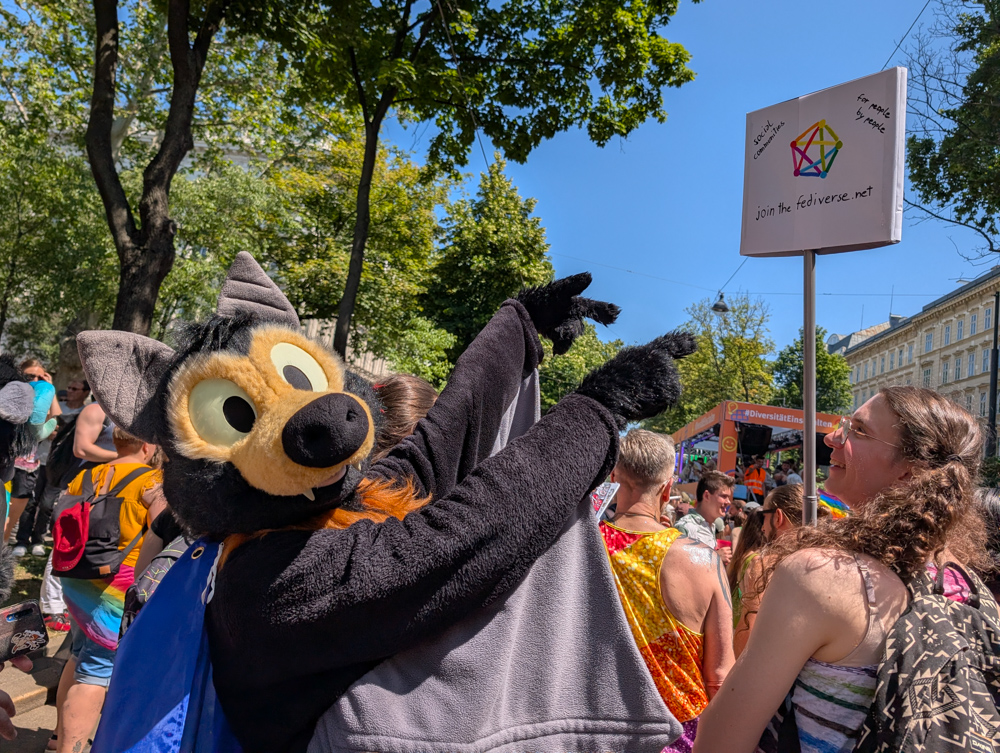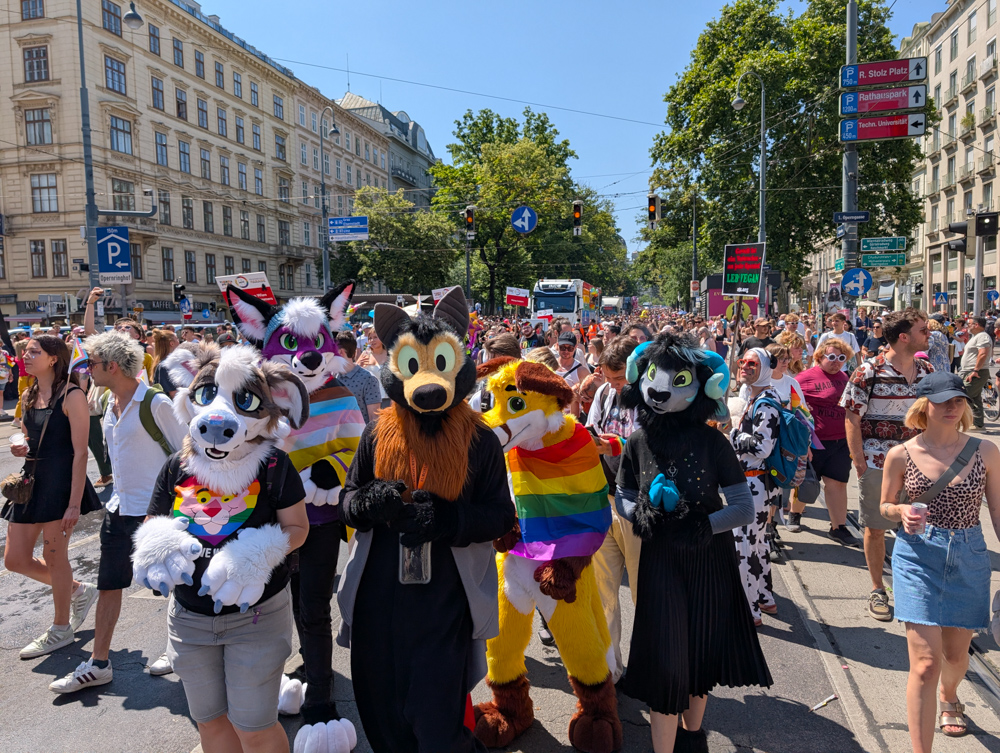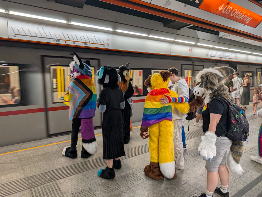 Tabbie, Spikie, Yoru and Nico came by around noon and picked me up, Henrieke stayed at home for now. I brought a small lunch and drinks, and we went to the Museumsquartier garage. Usually we park closer to the start of the parade, but this year the first part of the parade was quiet to commemorate the victims of a school shooting a few days earlier in Graz, hardly the place to run around in fursuits. So we parked at a garage closer to the start of the "regular" parade. Preasul and Sertro joined us as well and were nice enough to spot us.